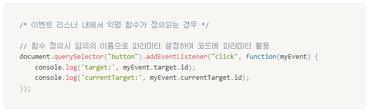 이벤트 리스너 내의 함수는 이벤트 객체를 대상으로 삼을 수 있으며, 이벤트 리스너 내 함수의 형태(ex. 이벤트 리스너 외부에서 정의된 함수를 콜백하는지, 이벤트 리스너 내에서 정의되는지)에 따라 이벤트 객체를 파라미터로 삼는 방법이 달라짐