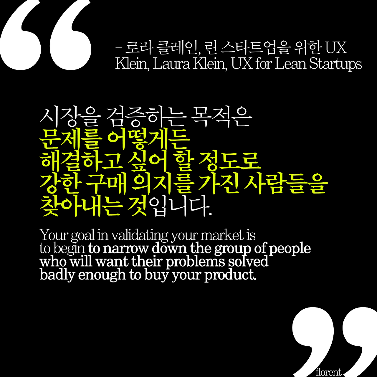 시장에 문제가 존재한다고 해서 사람들이 반드시 그 해결책에 돈을 지불하며 관심을 보이는 것은 아닙니다. 그래서 시장 검증이 필요합니다. 시장을 검증하는 목적은 문제를 어떻게든 해결하고 싶어 할 정도로 강한 구매 의지를 가진 사람들을 찾아내는 것입니다. 또한, 그들이 왜 관심을 가지는지를 정확히 파악하면 비슷한 동기를 가진 다른 시장도 공략할 수 있습니다.