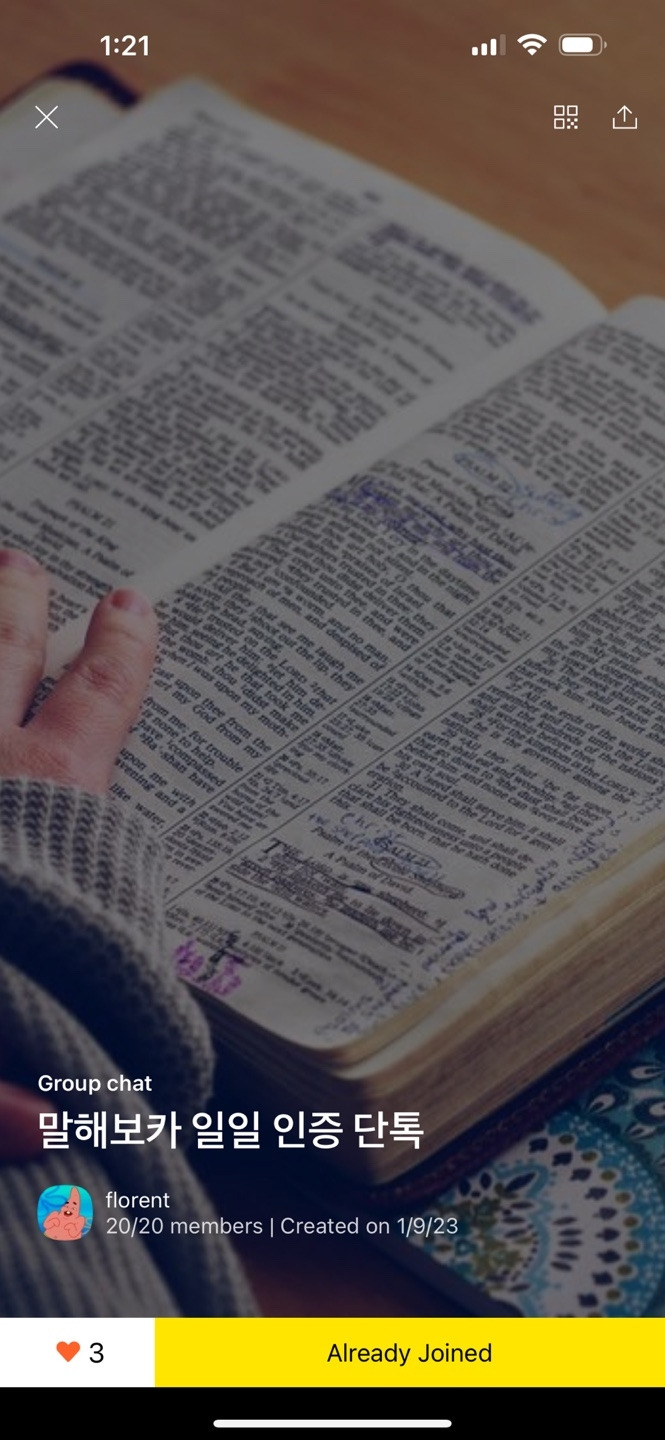 심지어는 단톡 내의 인원 사람들이 주변 지인에게 말해보카와 단톡을 홍보해주고 있기도 하다. 그렇게 해서 들어오신 분도 계시고, 인원 제한 때문에 아직 못 들어온 분도 계시다. 현재 인원이 20명인데, 단톡이 수작업인지라 인원 제한을 걸어두고 있어서 심지어 대기자가 발생하고 있는 상황이다.