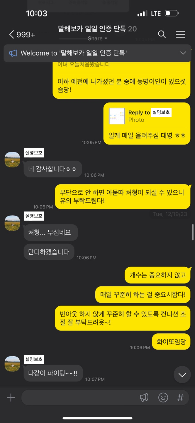 그렇기 때문에 수작업으로 인증 사진을 하나하나 확인하고 한명한명 멘션 메세지를 보내기로 했고, 사기가 떨어진 사람에게 동기부여를 하고자 노력했다. 물론 굉장히 비효율적인 방법일 수 있다. 말해보카 서비스도 이런 걸 선뜻할 수 없을 거라고 생각했다. 인적자원으로나 시간적으로나 소진되는 게 너무 클 수 있다. 하지만 이 세 가지 원칙으로 단톡을 운영하면서 나 스스로가 얻은 효과가 적지 않다.