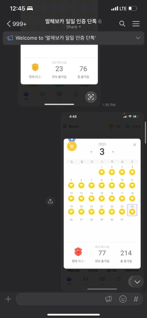 많이 하거나, 잘하고는 상관없다. 하루하루 컨디션에 맞게 양을 조절해서 영어 공부를 놓치지 않고 지속하는 것이 더 중요하다. 말해보카의 첫 화면에서 확인 가능한 '달력'을 스크린샷해서 매일 올리는 방식으로 인증을 진행한다.
