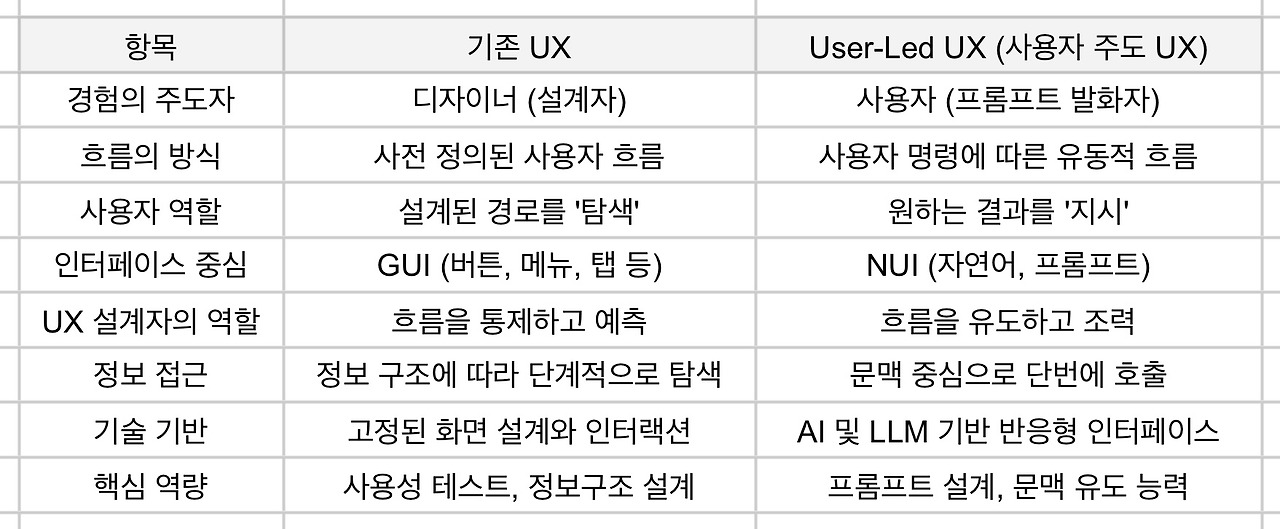 전통적인 UX가 디자이너가 경험을 설계하고 사용자가 따라오는 구조였다면, User-Led UX에서는 사용자가 흐름을 주도하고, 시스템(AI)을 능동적으로 이끄는 구조라 할 수 있다.