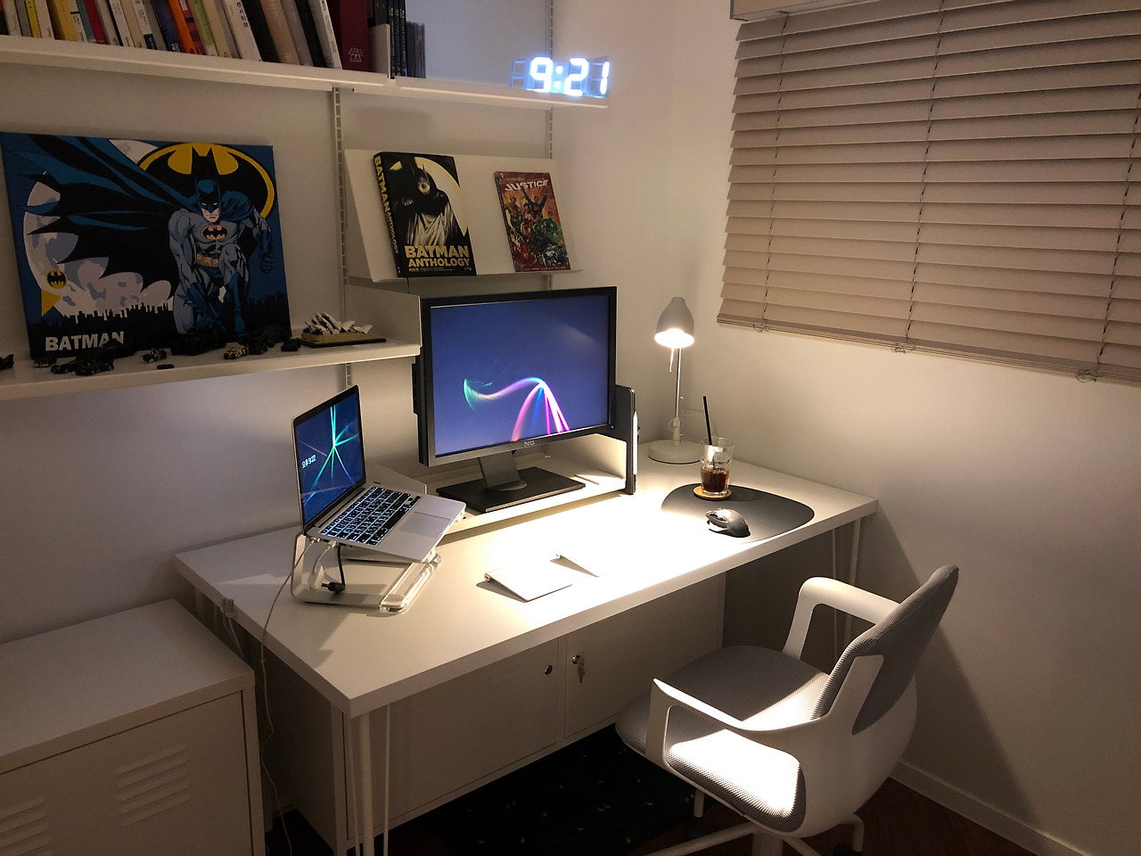네 번째 집. 결혼 후 방 하나는 서재로 꾸몄다. 이케아의 150cm 린몬 화이트 상판에 바퀴가 있는 크릴레 다리를 조립하여 이동이 편하게끔 했다. 사실 이동할 일은 별로 없다. 일종의 뚫어뻥 같은 개념이다. 평소엔 사용할 일이 없어도 막힌 순간 빛을 발하지 않는가! 모니터는 벽 선반에 올려 두었기 때문에 책상은 가벼운 상태를 유지할 수 있다. 주로 여기서는 노란 불빛의 스탠드 등을 켜고 이메일을 읽거나 글을 쓴다.