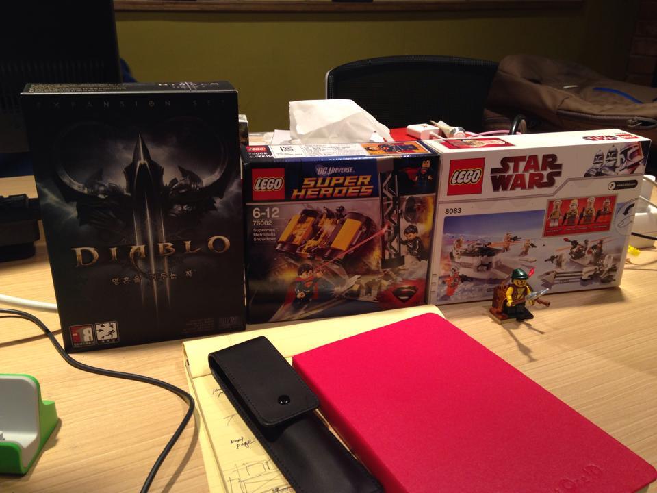 프로젝트 초반, 팀원과 회의실에서 일하는 중. 책상 위에는 디아블로 3, 레고가 올려져 있다. 빨리 집에 가고 싶었다.