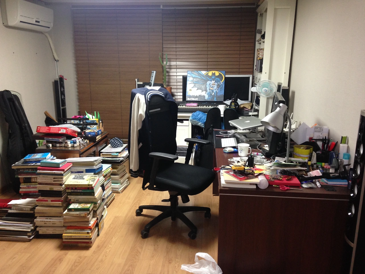이때는 야근이 너무 잦아 집에서의 생활이 거의 없었다. 방은 잠만 자는 숙소 같았기 때문에 갈수록 지저분해졌다. 휴가를 맞아 대청소하면서 책상과 책장 위치를 바꾸는 중이다. 책상 위에는 온갖 잡동사니가 너저분하게 올려져 있다.