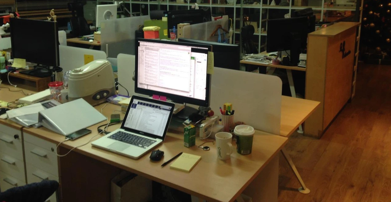 야근을 밥 먹듯이 하던 시절. 치킨을 먹고 있다. 내 책상은 일하고 있는 동료의 옆자리인데 아내와 함께 만들었던 머그잔이 눈에 띈다. 맥도날드에서 세트 시켜 먹고 받은 슈퍼마리오 장난감, 해외여행 다녀온 동료가 선물해준 코끼리 인형, 이제는 쓰지 않는 유선 이어폰도 있다. 근데 이 사진을 누가 찍은 거지?