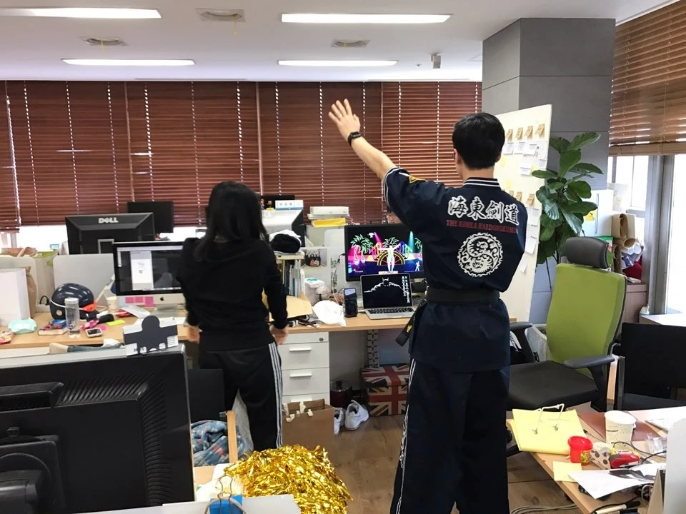 야근하다가 간식 타임 중이다. 손에 꼽을 정도로 규모가 컸던 프로젝트. 투입 인원도 많고 기간도 길었는데 그만큼 업무적으로 많이 성장할 수 있었던 시간이었다. 전날, 옆자리 동료가 내 의자에 슬리퍼를 벗어 두고 집에 갔길래, 모니터 아래에 있는 소시지로 때려 주었던 기억이 난다.