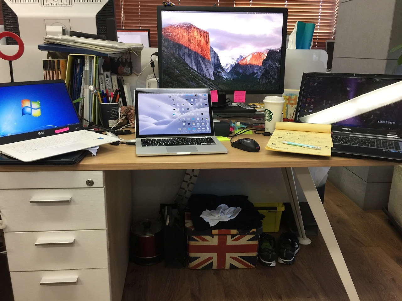 국책 과제의 성과공유회를 마치고 기관 제출을 위한 보고서 작업을 하고 있다. 사이트 로그인이 안 돼서 스트레스가 극도로 심했던 하루. 책상 위에는 맥북, 서로 다른 버전의 OS가 설치된 윈도우 노트북이 올려져 있다. 인스타그램에 이 사진과 함께, 망치나 도끼 같은 거로 세게 내려치고 싶다고 올렸는데 사장님이 하트를 누르셨다.