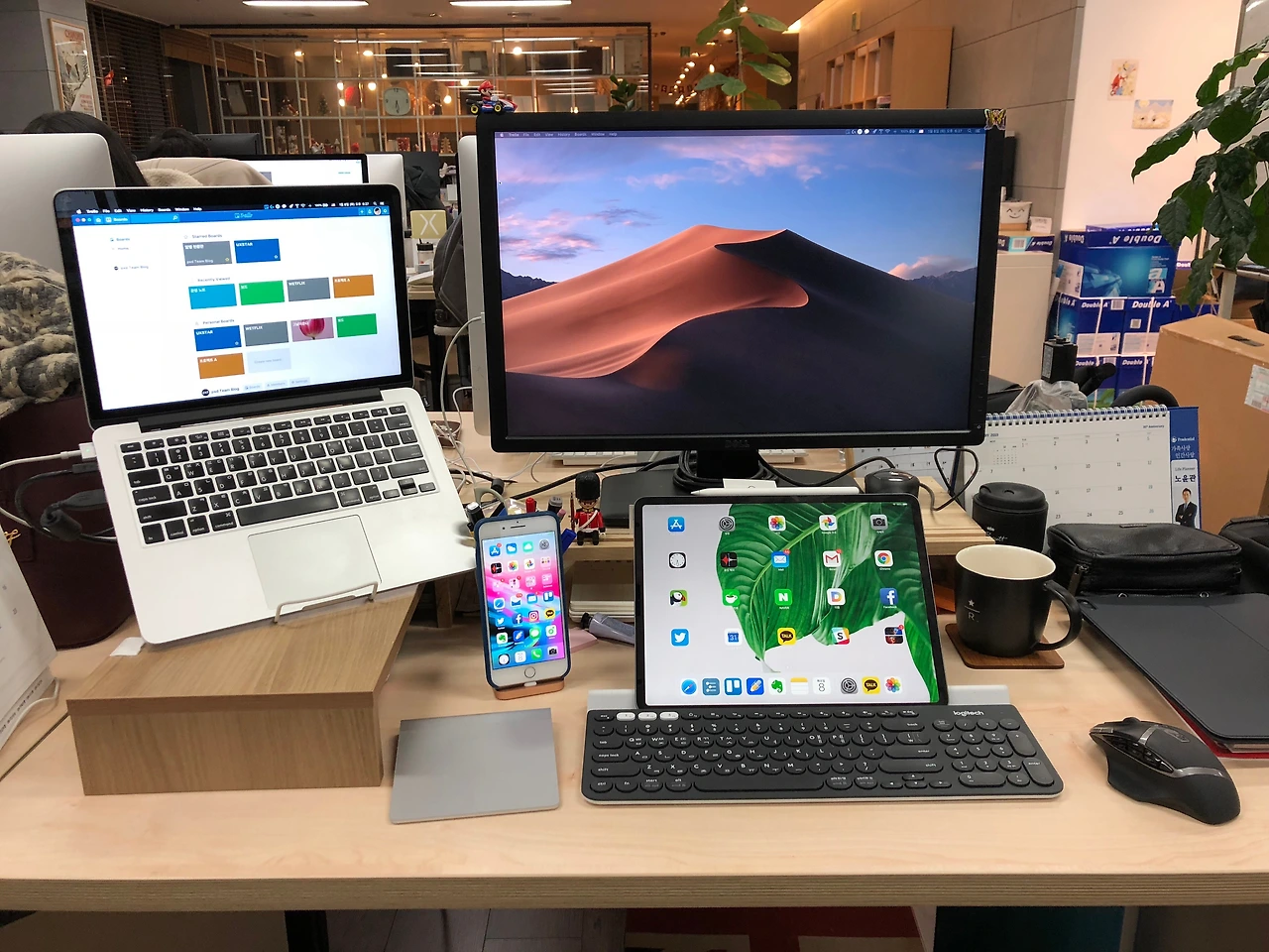 회사에서 기본으로 유무선 키보드가 지급되지만, 생산성 향상을 위한다는 구실로 새로운 키보드를 샀다. 이 키보드는 입력받는 장치를 손쉽게 바꿀 수 있다. 1번에는 맥북, 2번에는 아이폰, 3번에는 아이패드에 연결해 두었다. 정말 잘 산 기기 중 하나. 다만, 폰과 패드를 거치할 수 있도록 키보드 상단에 홈이 파여 있는데, 아이패드에 키보드 케이스를 씌울 경우 두꺼워서 거치 되질 않는다. 이 홈 간격을 수동으로 조절할 수 있었더라면 훨씬 좋았을 텐데.