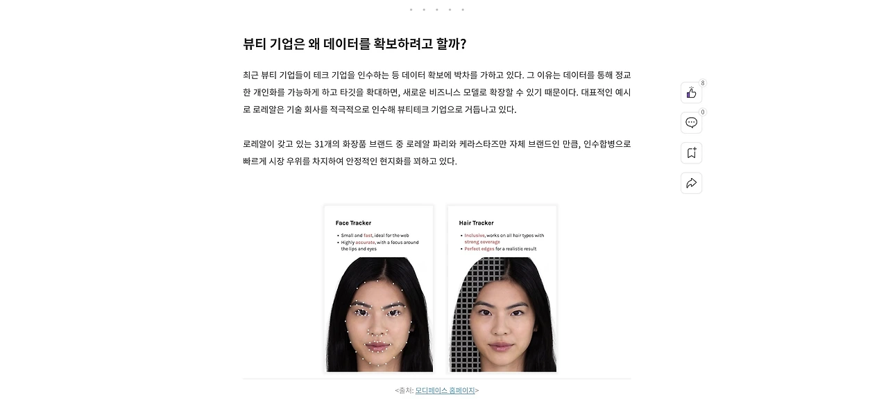 뷰티 업체들이 빠르게 테크 기업을 인수하고, 데이터를 활용하는 이유는 정교한 개인화가 가능해지고, 타깃을 확대할 수 있으며, 새로운 비즈니스 모델로 확장시킬 수 있기 때문이다. 대표적으로 로레알은 적극적으로 기술 회사를 인수하여 뷰티테크 기업으로 거듭나고 있다. 로레알은 적극적인 인수합병으로 유명한 기업이다. 로레알이 갖고 있는 31개의 화장품 브랜드 중 '로레알 파리'와, '케라스타즈'만 자체 브랜드인 만큼 공격적인 인수합병을 추진해 왔다. 성공적인 인수합병으로 빠르게 타깃 하는 시장에서 우위를 차지했고, 안정적으로 현지화를 할 수 있었다.