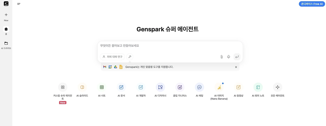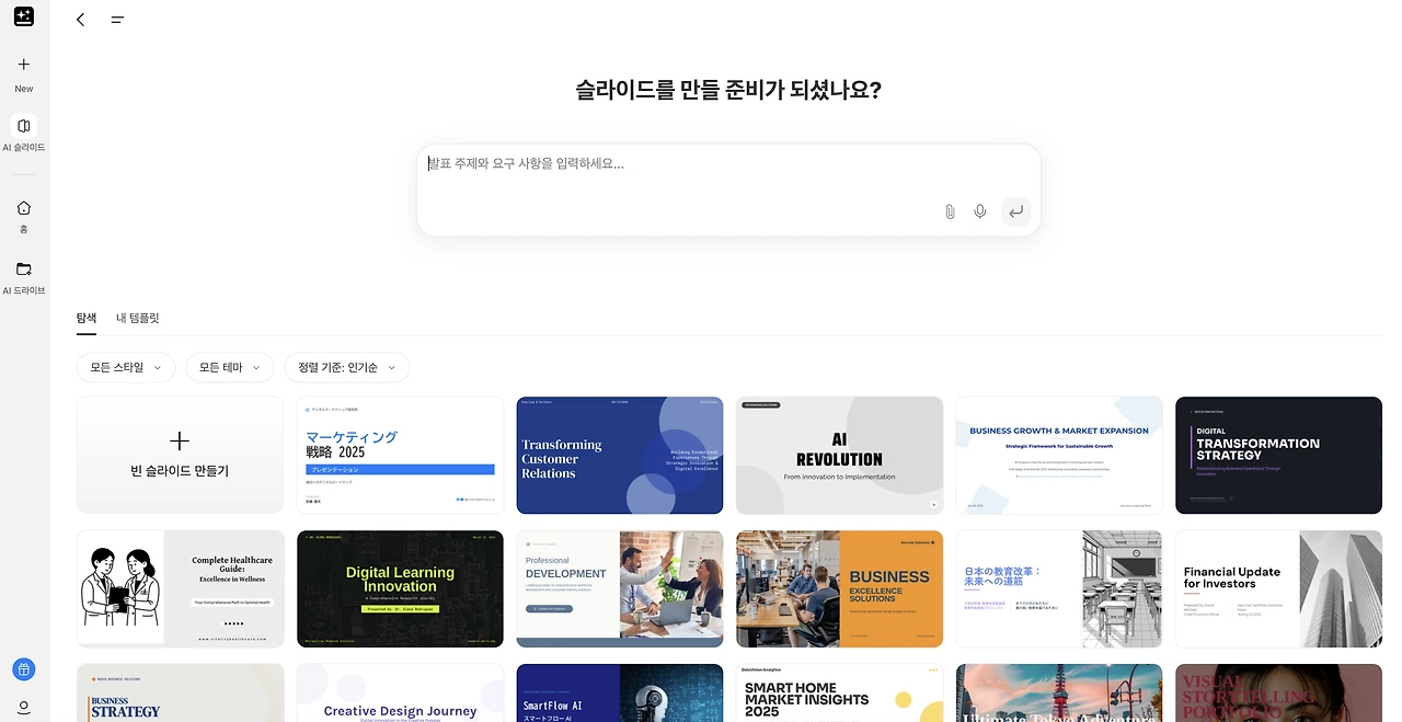 감마는 메인화면부터 PPT 제작에 특화된 느낌을 받았다. 그래서 젠스파크에 비해 직관적으로 다가왔다. 젠스파크는 올인원이라는 콘셉트가 들어가서 그런지 온갖 에이전트들을 다 갖다 붙여놨다. AI 슬라이드, AI 시트, AI 디자이너, AI 개발자 등등 모든 에이전트들이 메인에 다 같이 나오니 무슨 종합 선물세트처럼 보였다. 반면 감마는 AI PPT부터 전면에 나오니 확실히 사용하기 편했다.