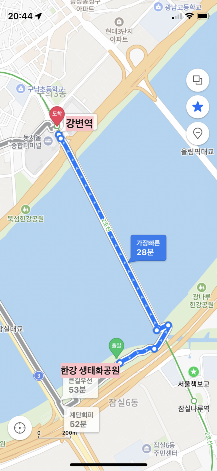저희는 잠실나루쪽 카페에서 출발, 한강 생태화공원을 거치고, 잠실철교를 건너 강변역에 도착, 이후 지하철을 타고 서울숲과 성수에 가 저녁시간을 즐겼답니다.