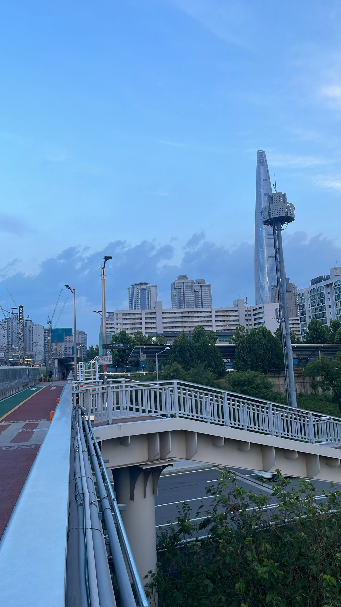 공원 산책로에서 살짝 옆으로 빠져나와요. 그러면 잠실철교로 들어서는 계단이 보이죠. 오늘 산책 코스이자 저희가 잠실까지 온 이유예요. 다리를 건너면서 낙조*를 보는 것. 초입구부터 왠지 느낌이 충만해요. 뭐랄까 일본 청춘 드라마에서 본 한 장면 같은데- 아니다, 이곳은 서울 그 자체죠. 다른 곳이랑 비교할 필요는 없을 거 같아요.