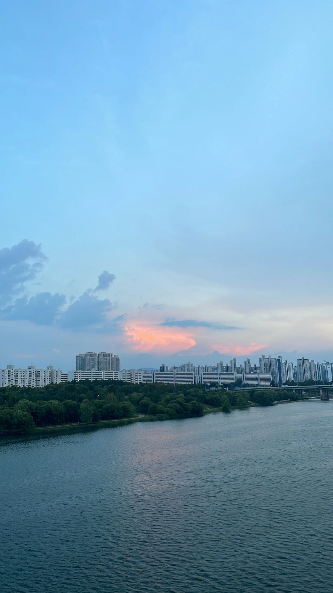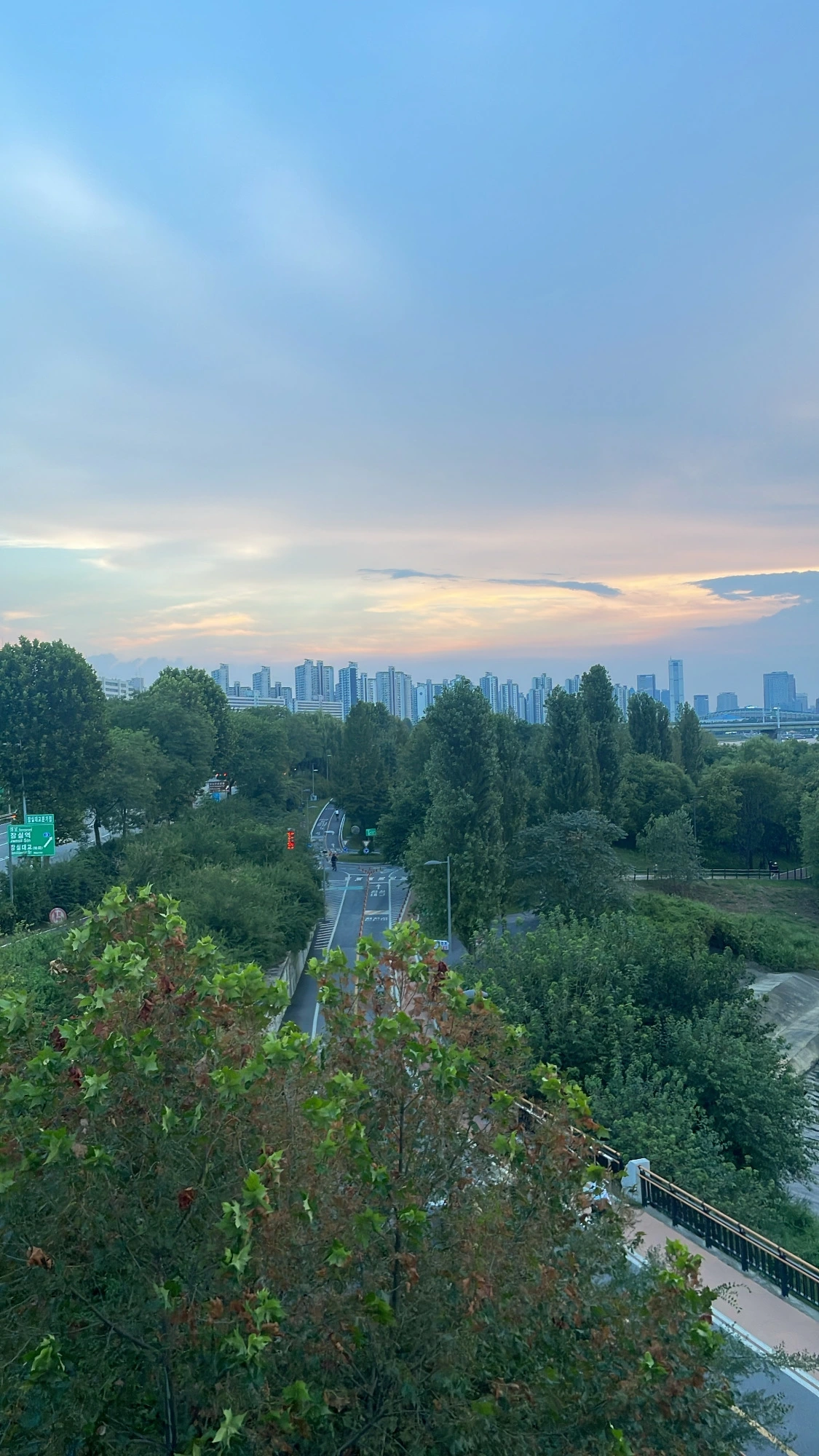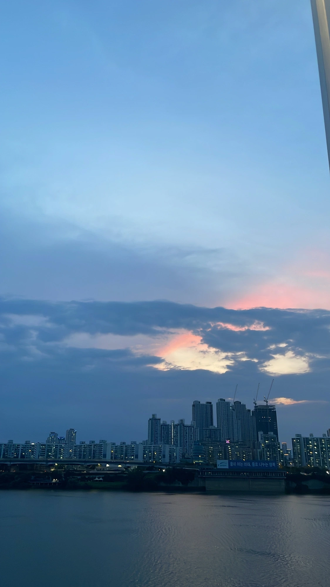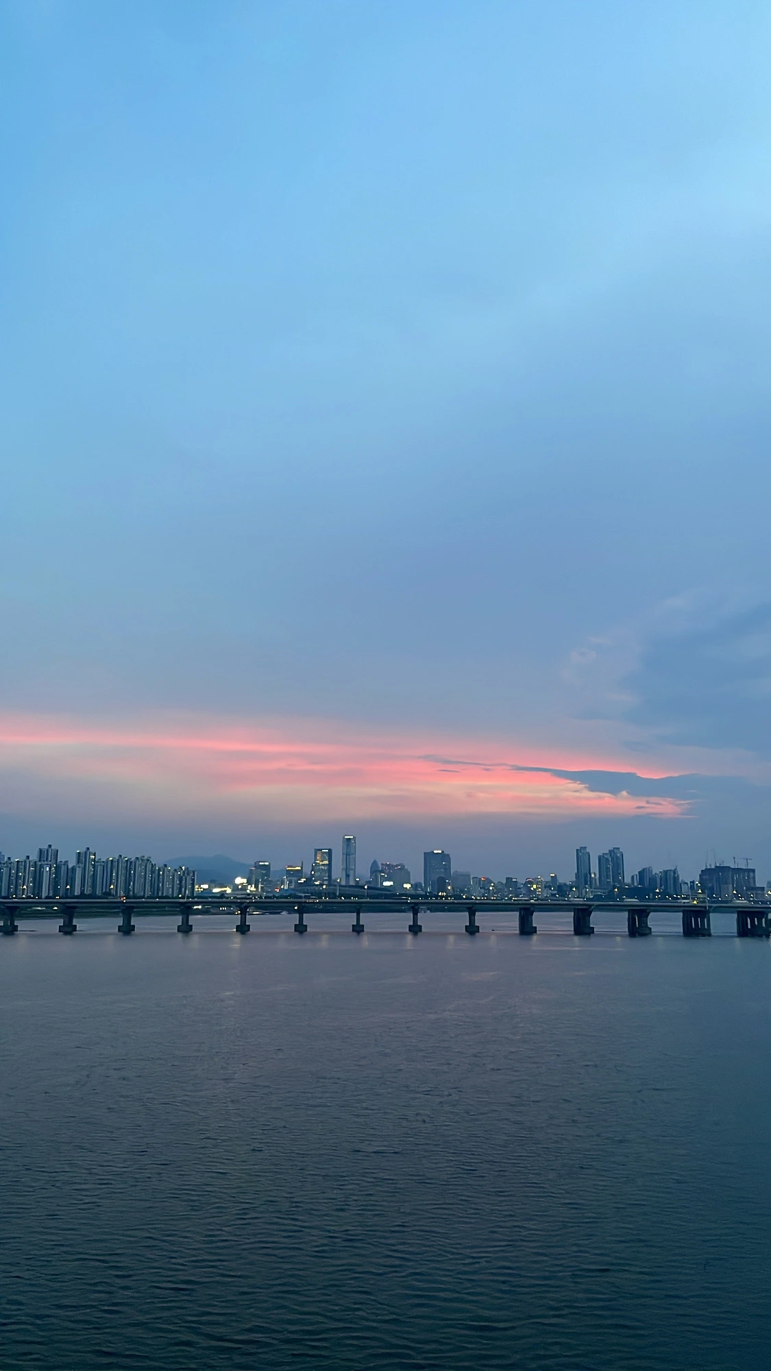 이제 철교를 천천히 건너요. 요즘 저녁 일곱시 경 해가 지기 시작하죠. 한강을 건너는 다리들은 해가 천천히 지는 과정을 그대로, 다른 방해물 없이 경험할 수 있는 장소인 것 같아요. 낙조가 진행되는 동안 하늘은 색깔을 서서히 바꾸어요. 모방하거나 예측할 수 없는 색깔과 모양으로 눈앞에 펼쳐져요. 마치 마법이 일어나는 것처럼요.