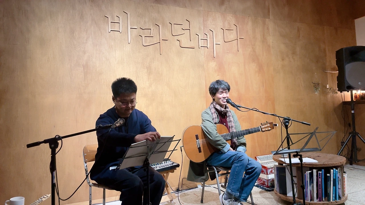 김목인이라는 가수. 남자친구와 그의 노래를 종종 들었다. 멜로디에는 컨트리풍의 편안함이 있고 직접 쓴 가사가 어렵지 않고 시적이라는 느낌이 들었다. 이번처럼 관객과 가까이 마주 앉아 열리는 소규모 공연과도 매우 잘 어울리는 곡들을 많이 부르는 가수이다. 곡마다 부르기 전에 가사가 쓰인 배경을 대화하듯 전달해 주셨다. 곡과 가사에 대한 가수의 경험이 그림처럼 그려졌다. 일상에서 만나는 모든 것들에서 작품을 긷는 사람이 예술가가 아닐까라고 나는 생각했다. 가수와 오랜 시간 함께한 친구분도 공연에 함께해서 더 풍성한 무대였는데, 음악을 좋아하는 사람들이 만드는 공연을 가까이서 듣고 보는 것 역시 벅찬 경험이었다.