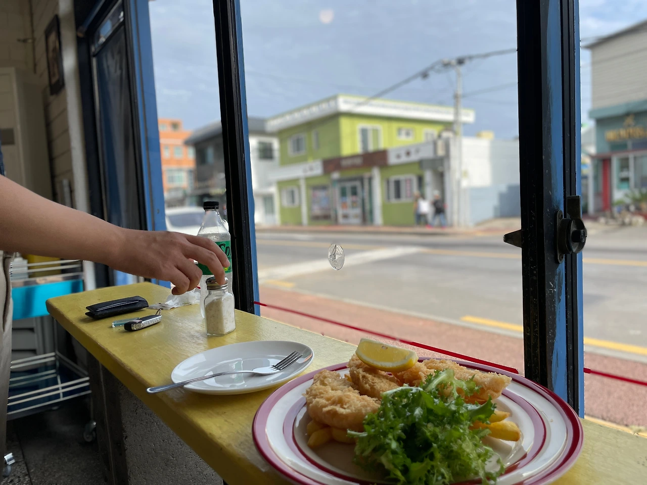 날씨가 좋아 우도에 갈까, 성산일출봉에 갈까 얘기하며 자리를 옮겼다. 우도에 가려면 배 시간을 맞추어야 했기에 우리는 조금 더 여유 있게 돌아다닐 수 있는 성산일출봉으로 향했다. 그리고 근처에 있는 피쉬앤칩스 가게에서 가볍게 점심을 먹었다. 지난번에 함께 왔던 식당에 다시 들를 수 있어 좋았다. 지난 여행 때의 좋은 기억, 이번 여행에서의 새로운 감상이 교차해서 좋다. 추억을 하나 더 쌓아 올리고 간다.