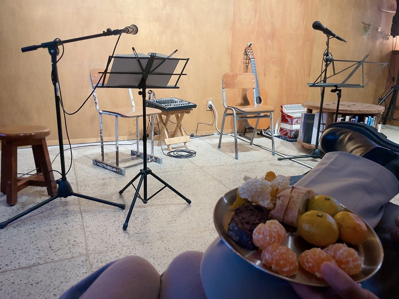 공연 한 시간 전에 공연장소에 도착했다. 비를 뚫고 운전해서 도착한 곳에서 스태프분이 우리 차를 보고 뛰어 마중 나오셨다. 처음 보는 사람이지만 멀리서부터 반갑게 인사를 해주셔서 환영받는 기분이 들었다. 입구에 들어서자 우드톤의 인테리어를 배경으로 예쁘게 준비된 무대와 객석이 보였다. 스태프는 우리에게 공연이 시작되기 전 준비된 빵과 귤을 먹으며 쉬면 된다고 안내해 주셨다. 어제 일찍 출발해서 조금 피곤하기도 했던 우리에게 기대에 없던 따뜻한 휴식시간이 주어졌다. 맨 앞 소파자리에 앉아 커피와 빵, 제주 감귤을 먹으면서 공연을 기다렸다. 수수한 대화가 오가는 장면들이 낯설면서도 좋았다. 따뜻한 응대와 이 좋은 낯섦 덕분에 우리에게는 기다림보다 휴식 같은 시간이었다.