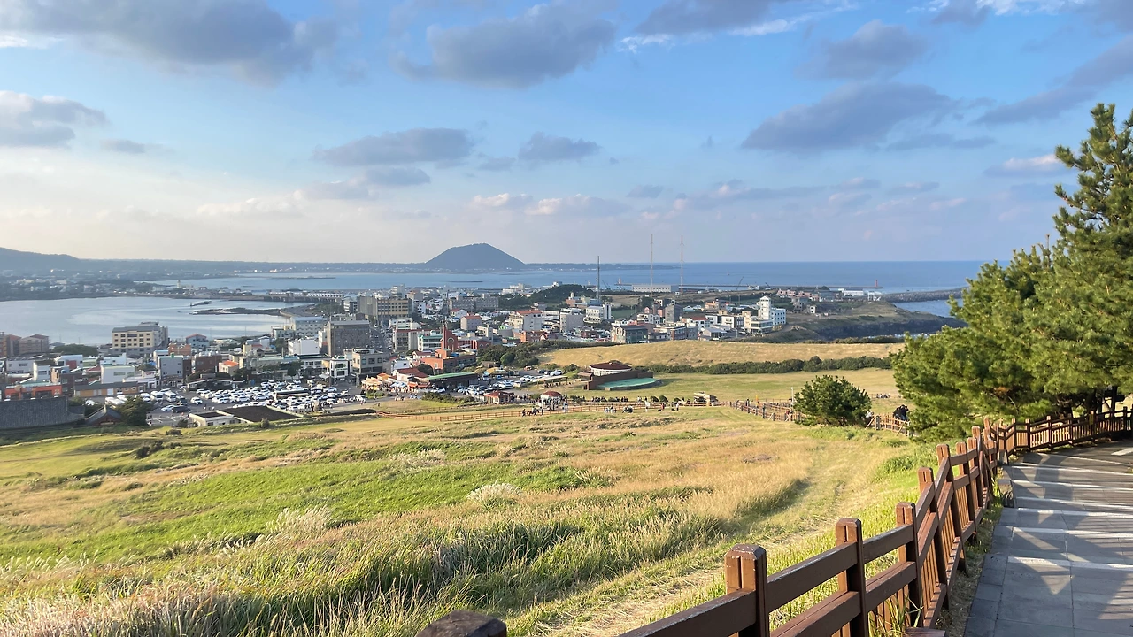 곧 정상에 올랐다. 그때의 기억과는 아마 사뭇 다른 모습이었다. 아직 겨울이 오지 않아 분화구에 나무가 무성히 자라 있었다. 가쁜 숨을 고르며 정상에 오른 기분을 즐겼다. 같이 올라온 사람들도 보였다. 우리처럼 숨을 고르며 대화하는 사람들의 모습을 보는 게 재밌었다. 남자친구와 나는 일출봉에 오른 뒤 "해냈다"며 무척 좋아했다. 성산일출봉에 오르는 건 계획에 전혀 없었지만 이번 여행에서 매우 강렬한 기억으로 남았다. 우리는 시원한 바람으로 땀이 충분히 식어갈 즈음 하산했다. 하산하면서 무료 코스로 이어지는 길을 따라 걸었다. 바다 위 가파르게 깎인 커다란 암벽 같은 성산일출봉의 옆모습이 그야말로 절경이었다. 우리는 이렇게 또 하나의 시간을 하나 쌓아 올렸다.