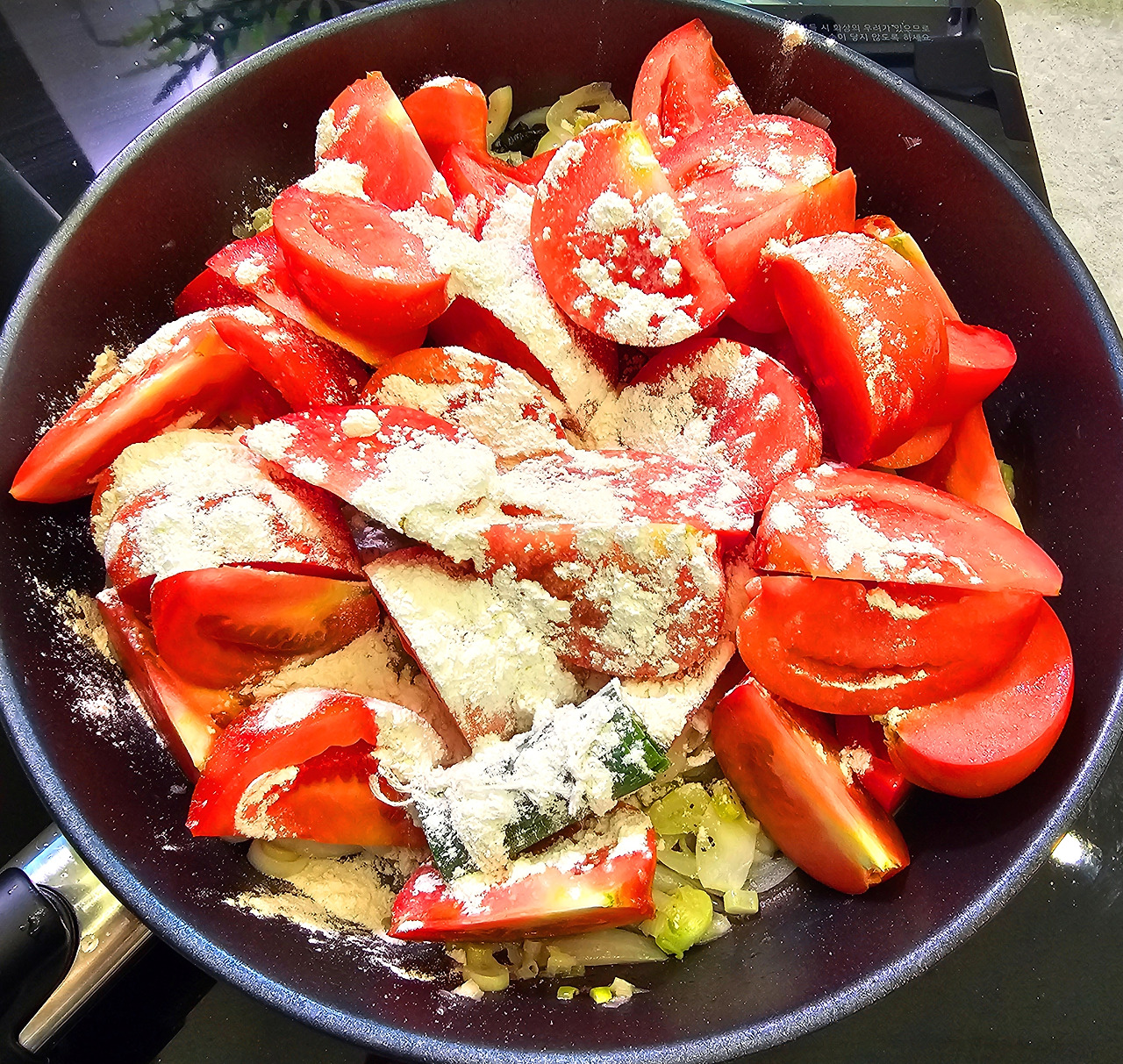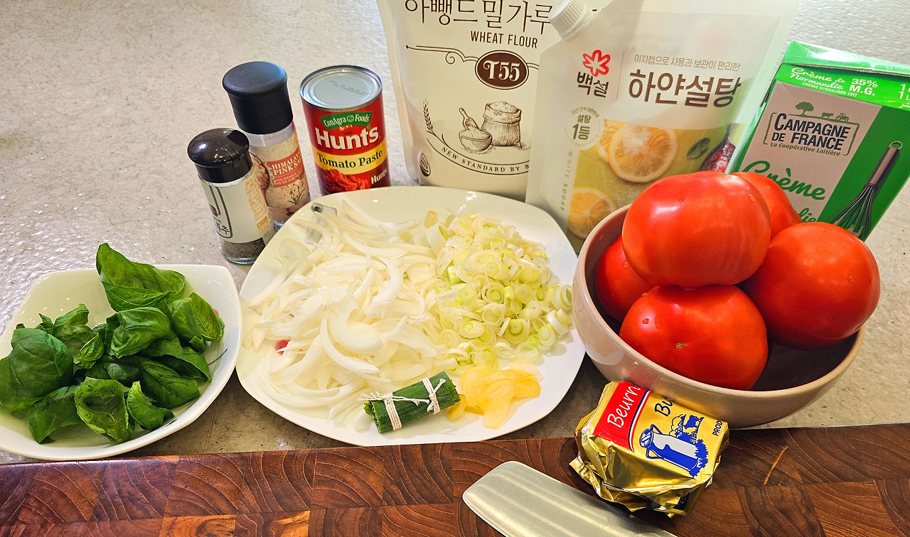 잘 익은 토마토, 양파, 대파 흰 부분, 마늘, 바질, 버터, 토마토 페이스트, 설탕, 부케가르니, 밀가루, 닭육수, 생크림, 소금, 후춧가루
