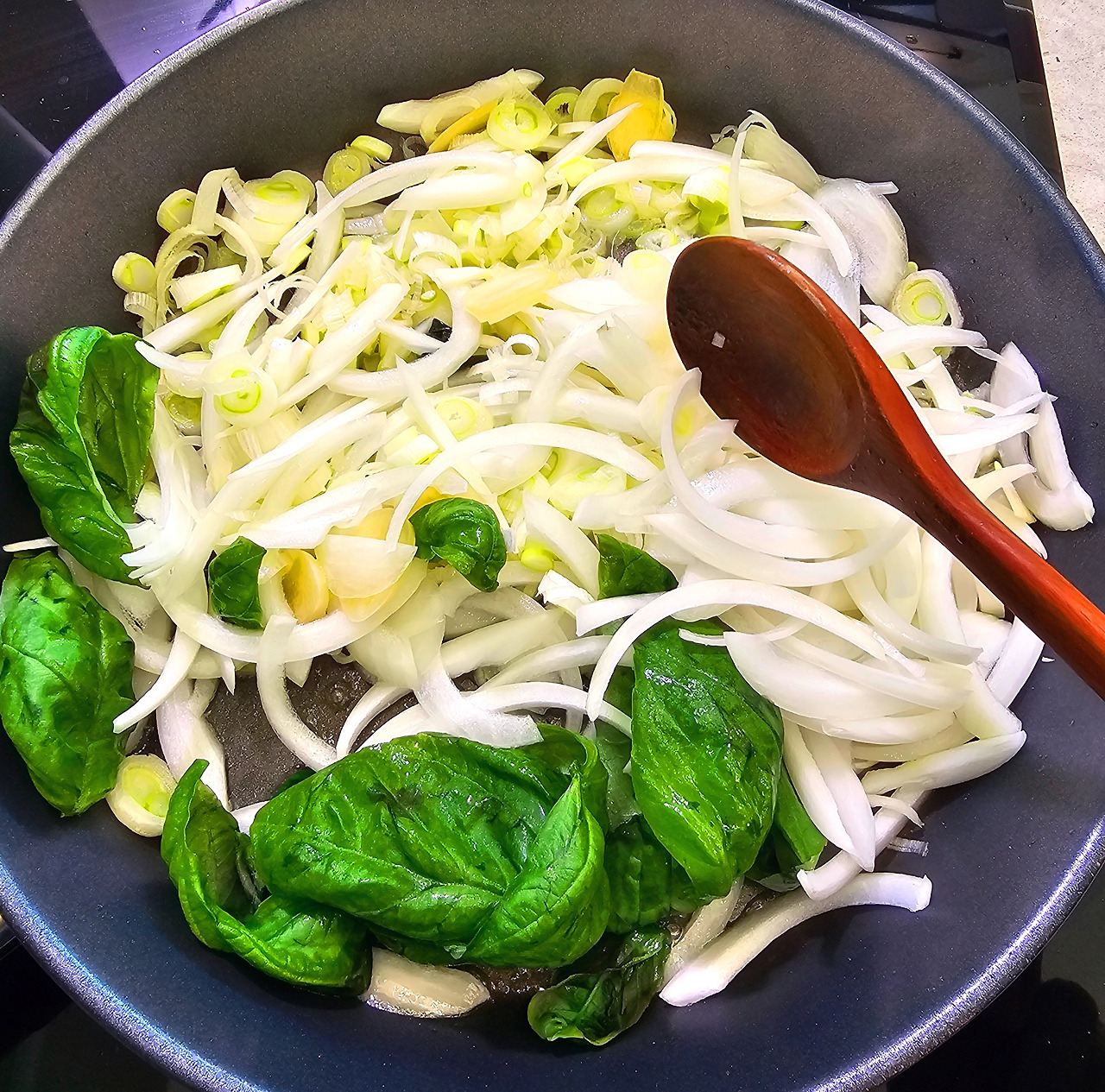 냄비에 버터를 넣고 바질, 양파, 대파(흰 부분), 마늘을 넣고 볶아준다. 어느 정도 볶아졌으면 토마토페이스트, 토마토, 소금, 후춧가루, 설탕, 부케가르니, 밀가루 순으로 넣어 약한 불에 15분 정도 끓인다.