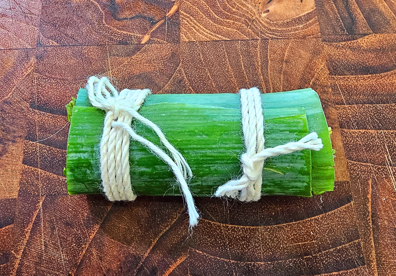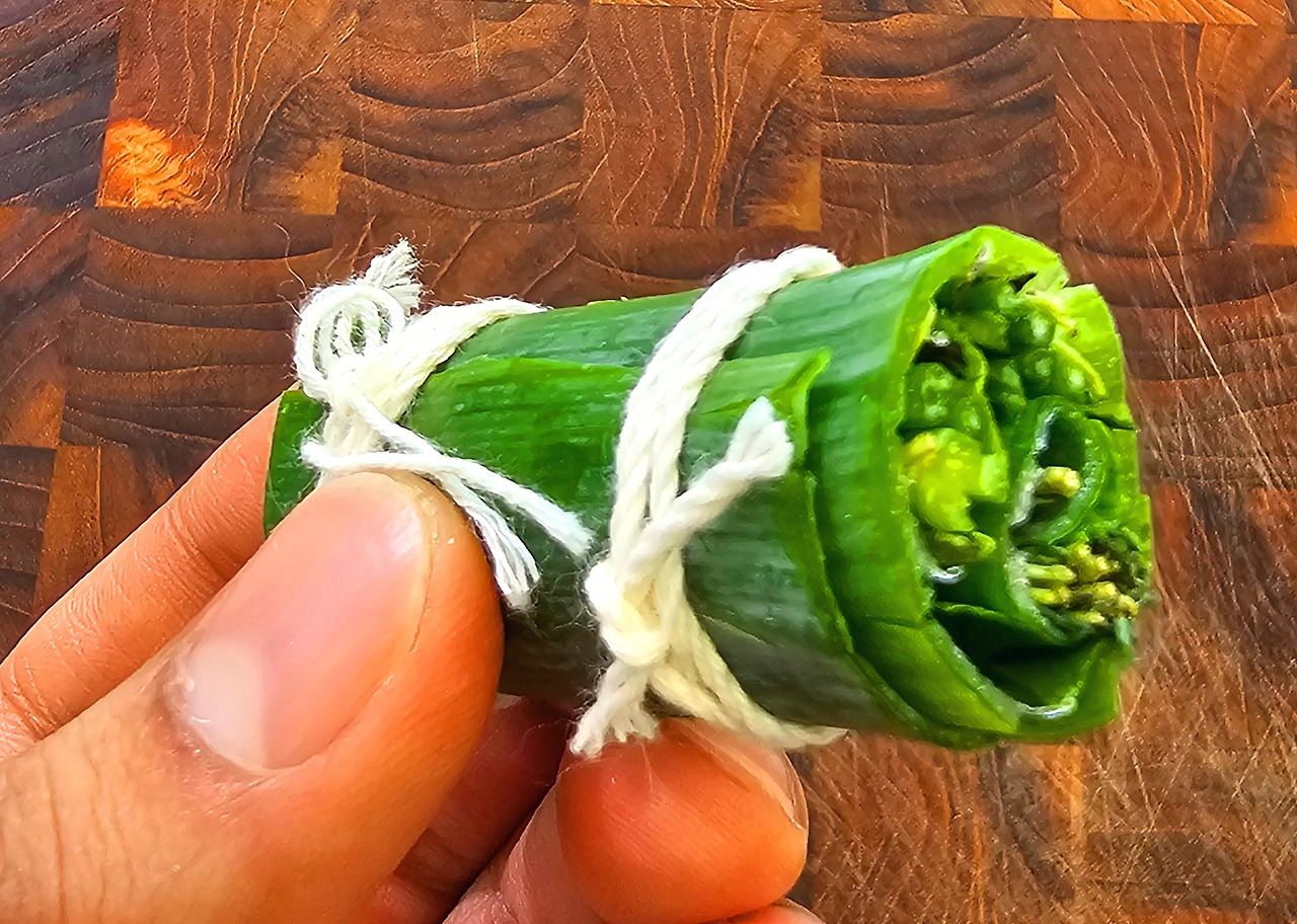 부케가르니 만드는 방법은 간단하다. 타임, 셀러리, 파슬리, 대파가 필요하며, 대파 속에 재료를 넣고 돌돌 말아서 요리용 실로 묶으면 완성이다. (생각보다 귀엽게 만들어졌다.)