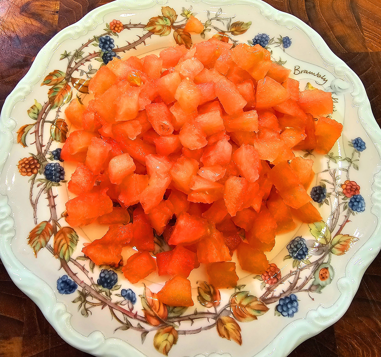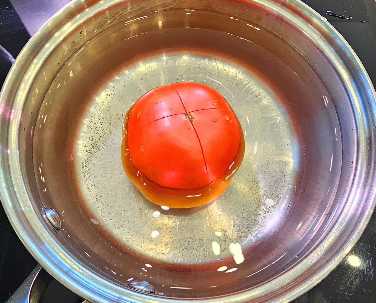이제 생토마토 콩카세를 만든다. (콩카세는 채소를 주사위 모양으로 아주 작게 자르거나 다지는 방법을 말한다.) 토마토 껍질을 쉽게 벗기기 위해서 열십자로 칼집을 내주고 끓는 물에 데친 후 건져 찬물에 담근다. 토마토 껍질을 벗겨 씨를 제거하고 작은 주사위 모양으로 깍둑썰기를 한다.
