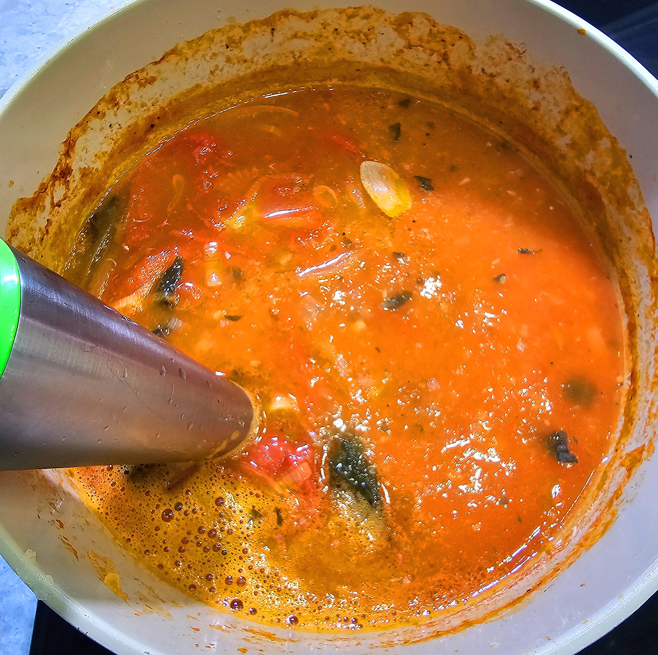 이제 닭 육수를 붓고 약한 불에 약 30분 정도 슬슬 저어 가며 끓인다. 충분히 재료가 익은 것 같으면 부케가르니는 건지고 나머지 재료들을 믹서로 갈아준다. 핸드믹서가 있으면 냄비에서 쉽게 갈아줄 수 있다.