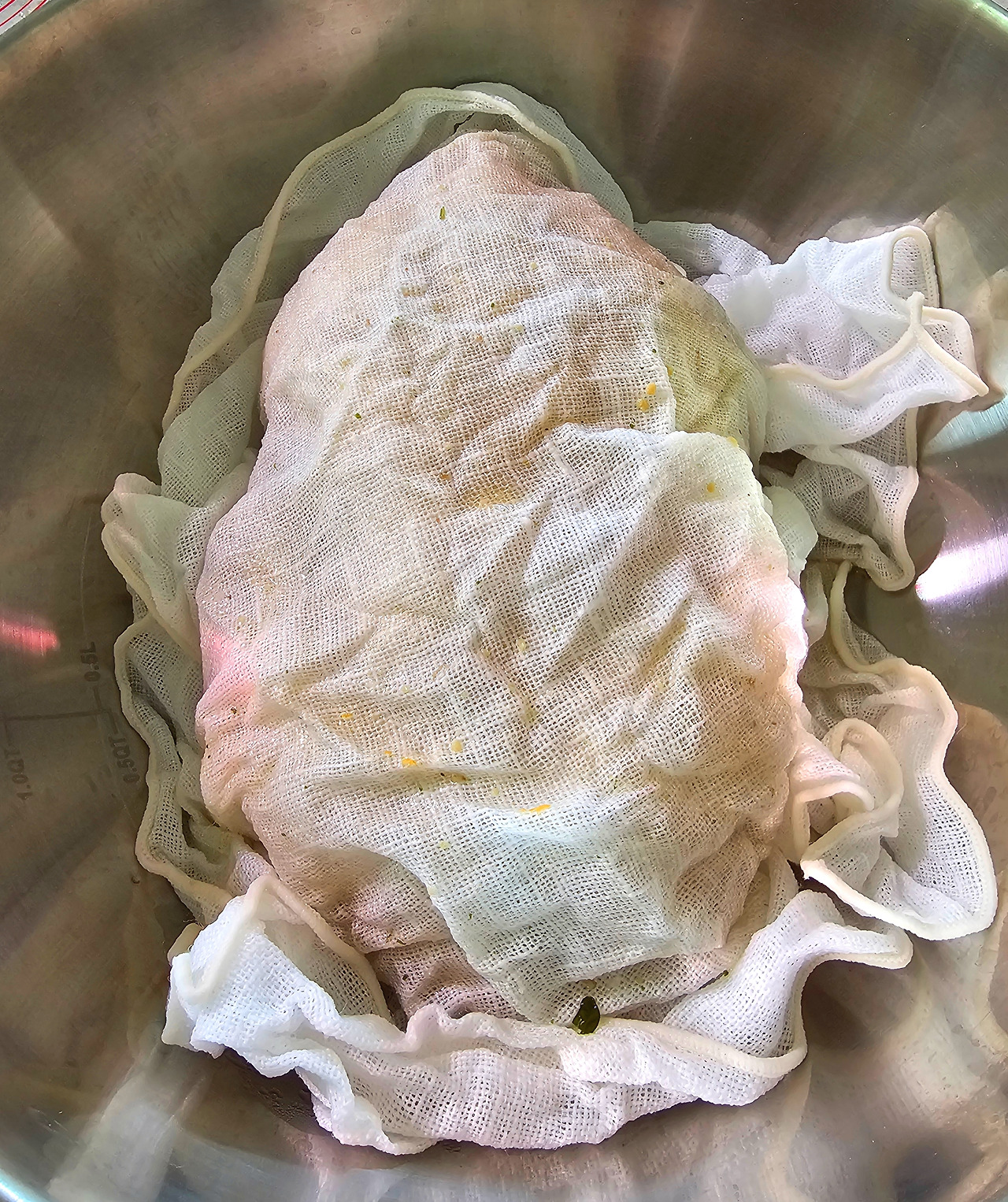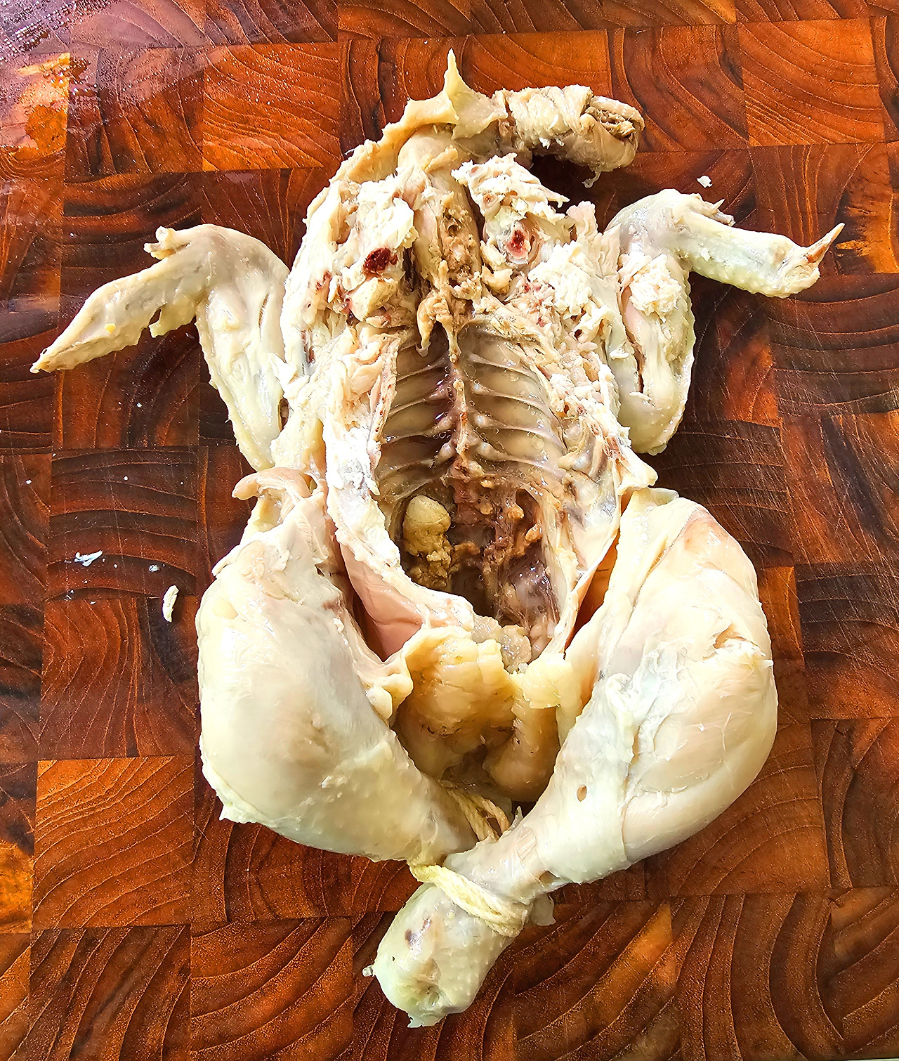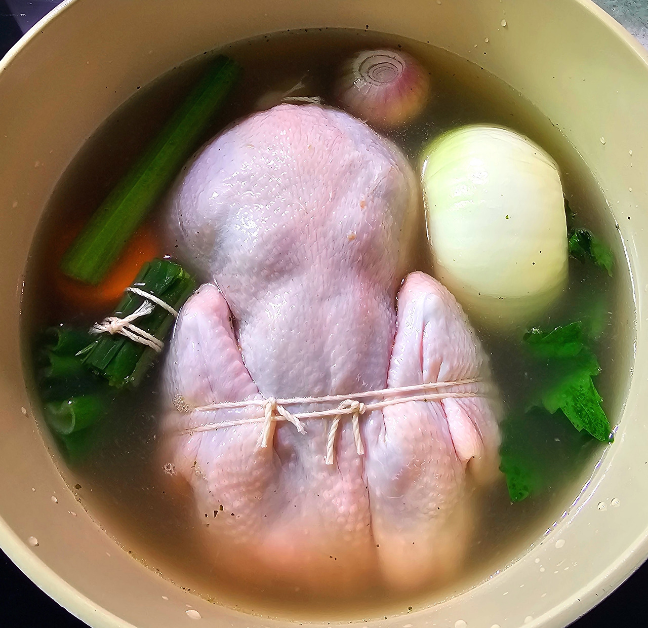 생닭은 아기(?) 다루듯이 어루만지면서 다리와 날개를 요리용 실로 묶은 뒤 냄비에 넣는다. 그리고 양파, 당근, 셀러리, 대파, 부케가르니를 넣고 마지막으로 육수를 냄비에 붓는다. 중불에서 약 45분 정도 끓인다. 닭이 익은 게 보이면 닭을 건져내고 마르지 않게 젖은 면포로 싸서 둔다.