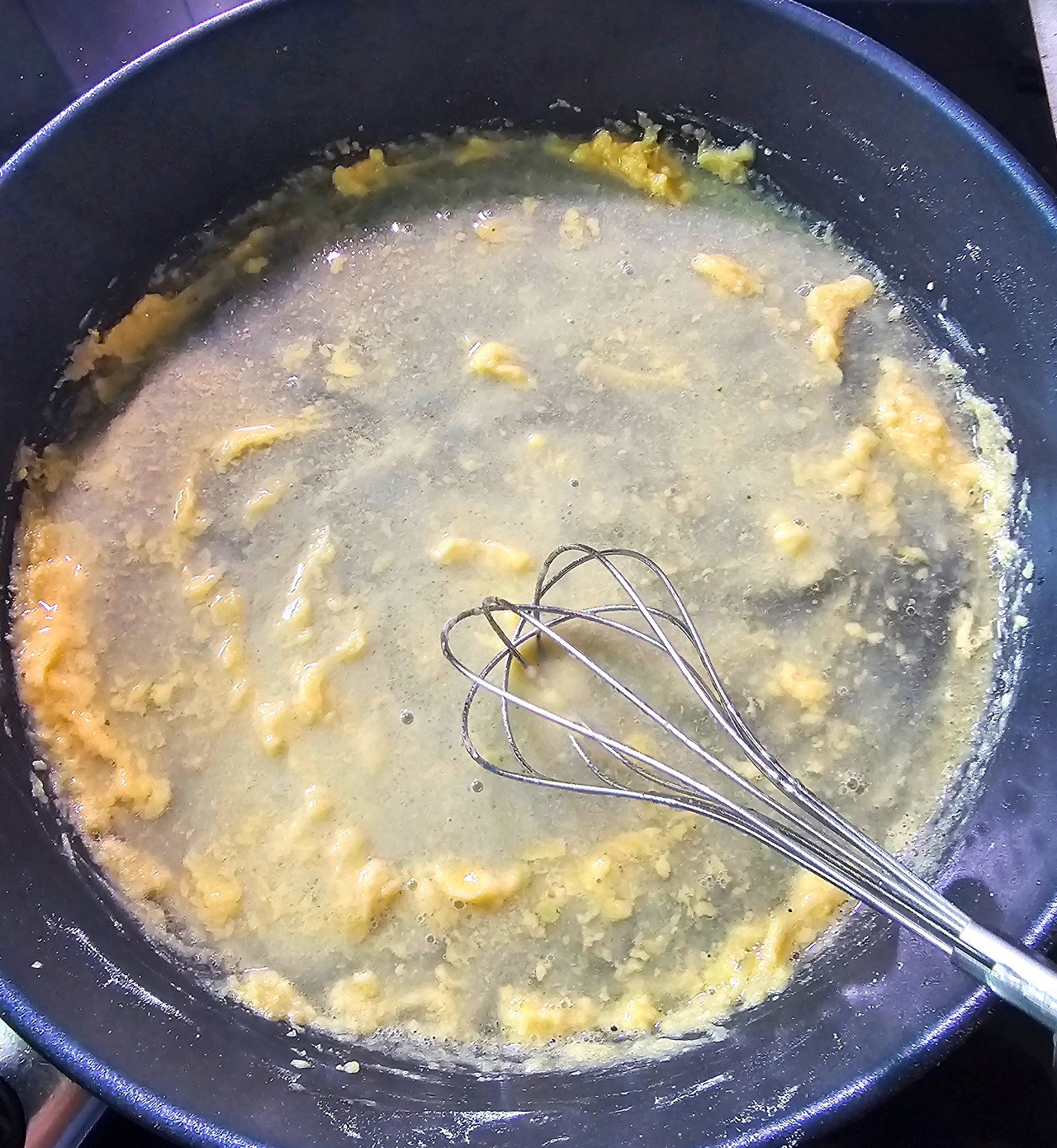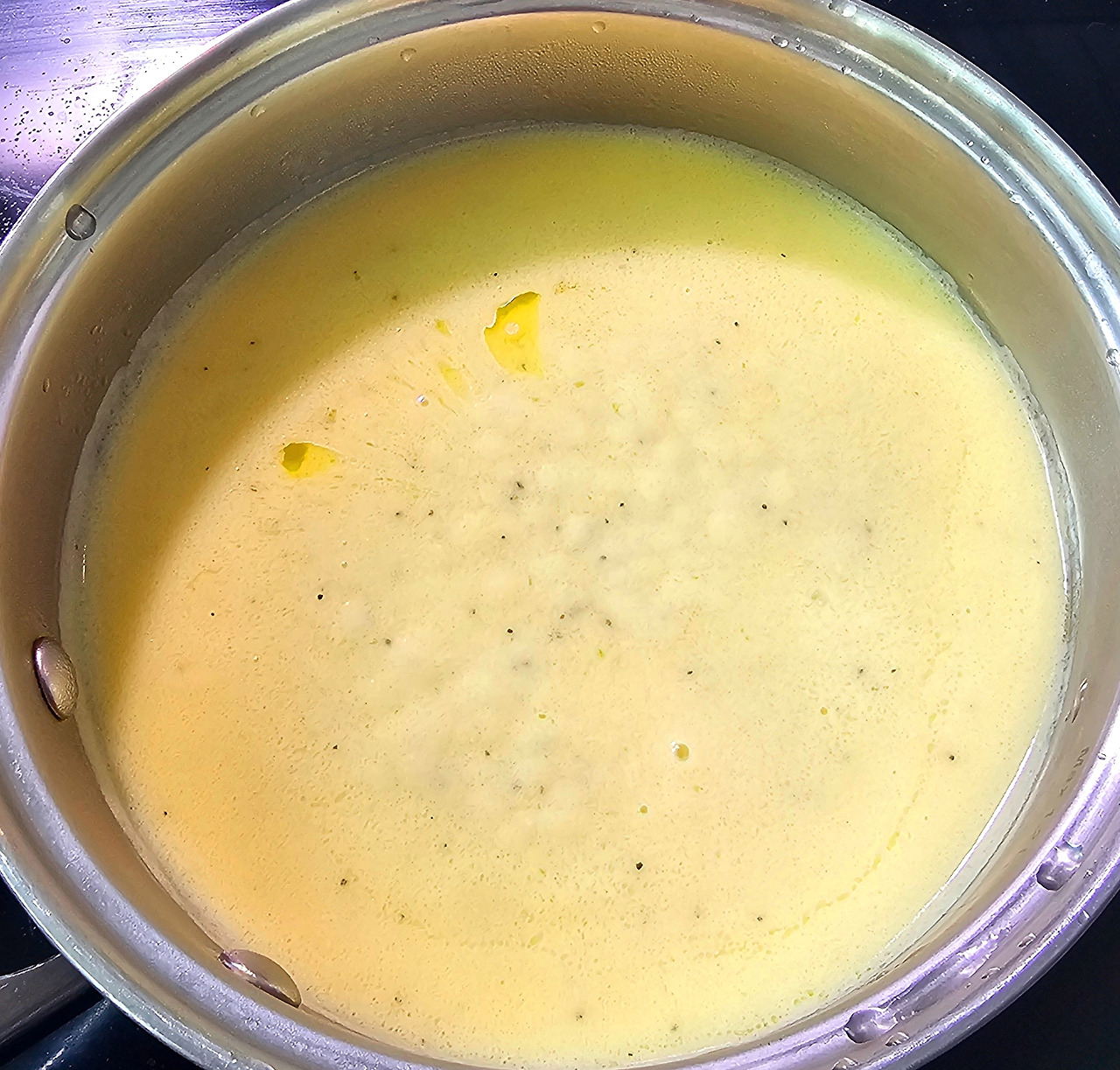 프라이팬에 버터와 밀가루를 넣고 흰색 루(roux)를 만들어 식힌 후 닭 육수를 조금씩 부어주면서 블루테를 만들어 준다. 끓기 시작하면 약한 불로 줄여 30분 정도 끓이고 생크림을 넣고 몇 분 더 끓인다.