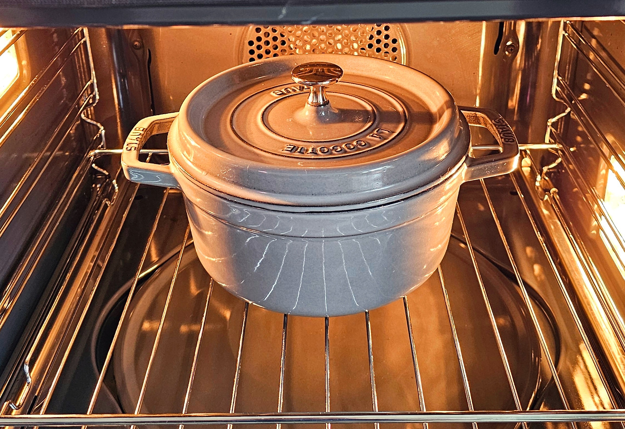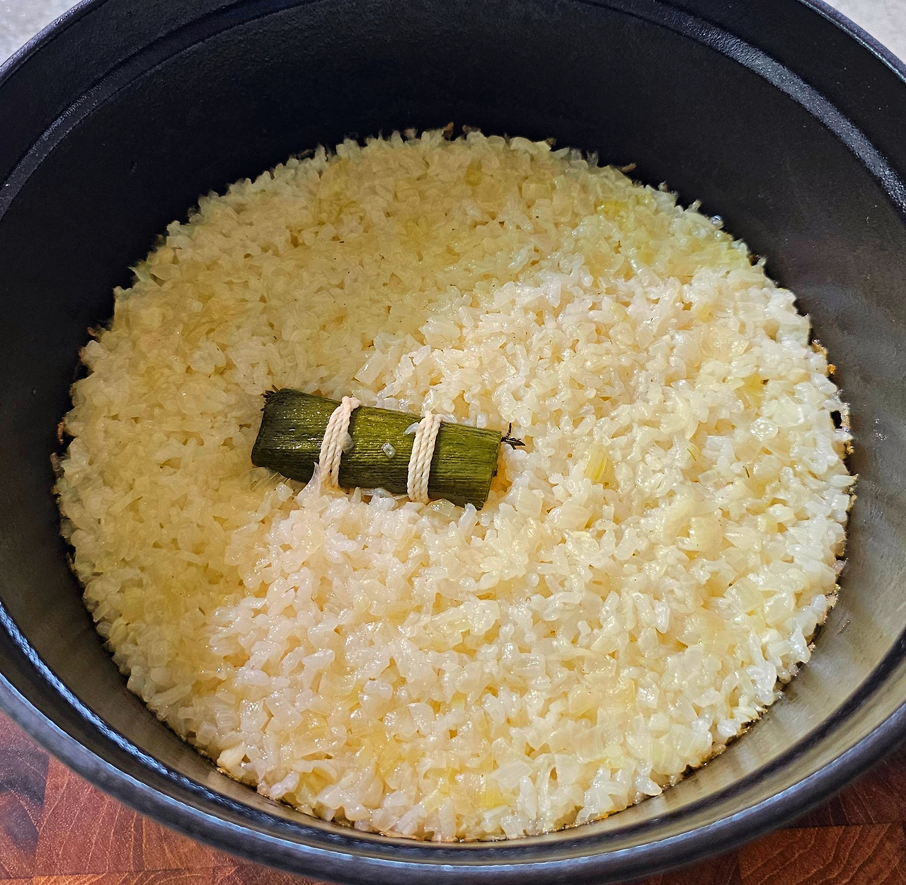 끓기 시작하면 소금 간을 하고 부케가르니를 넣고 뚜껑을 덮어준다. 180도로 예열한 오븐에 넣고 20분 정도 익혀주면 필라프 완성이다.