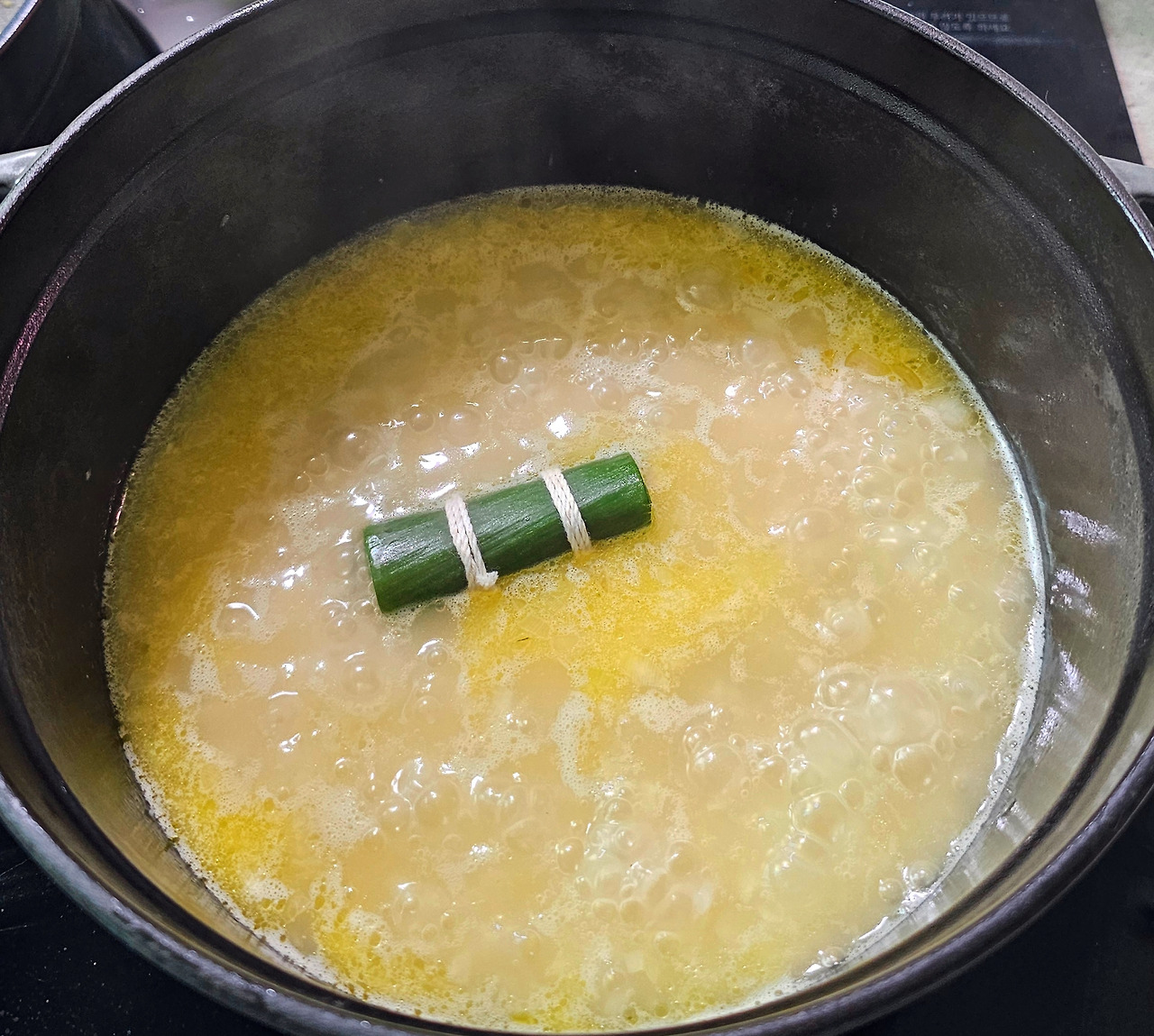 닭고기 육수 : 닭고기, 당근, 리크, 양파, 부케가르니, 셀러리를 넣어 만든 흰 육수