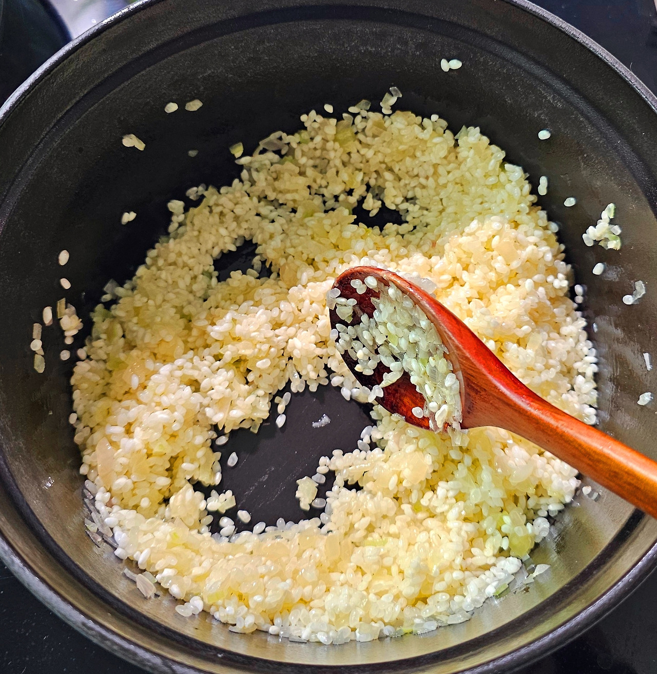 오븐용 냄비에 버터와 다진 양파를 넣고 약한 불에서 천천히 볶아준다. 그리고 쌀을 넣고 볶아준 다음 육수를 붓고 끓인다.