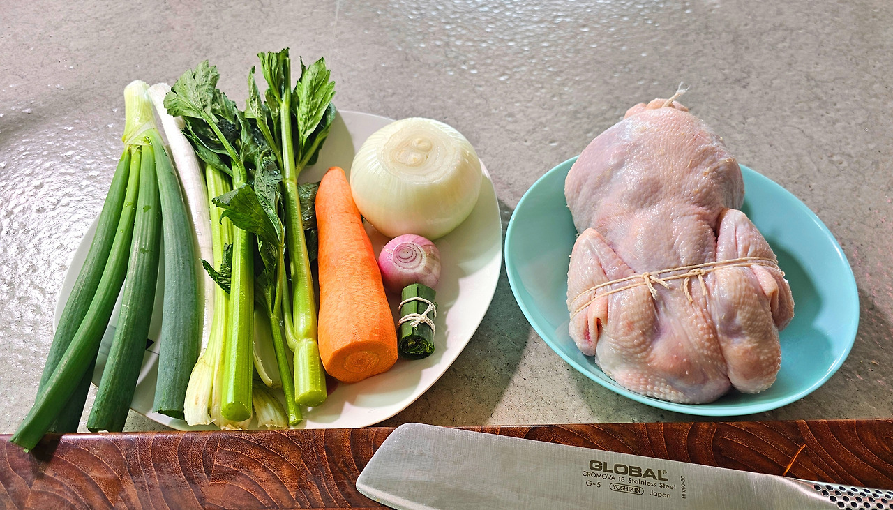 영계 1마리, 당근, 양파, 대파, 셀러리, 부케가르니, 닭 육수(물도 가능)