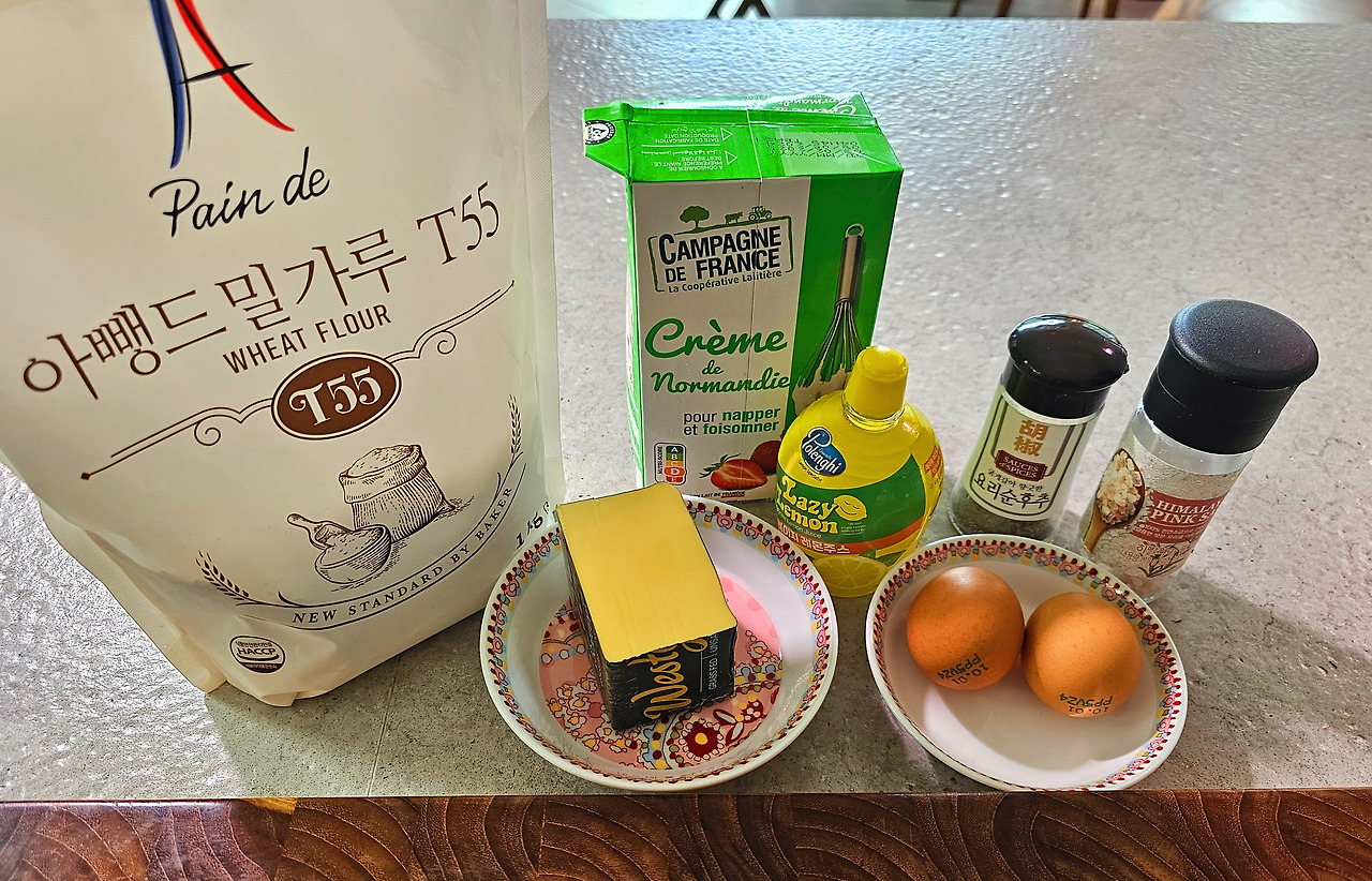 버터, 밀가루, 닭 육수(닭고기 삶고 나온 국물), 생크림, 달걀노른자, 레몬즙 1개분, 소금, 후춧가루