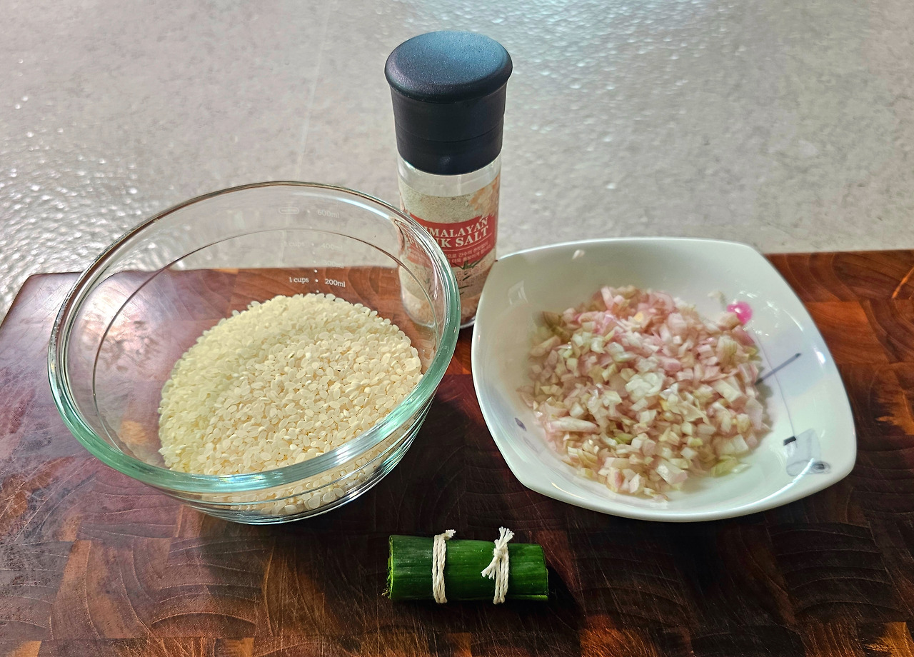 쌀, 다진 양파, 부케가르니, 소금, 닭 육수(쌀의 1.5배)