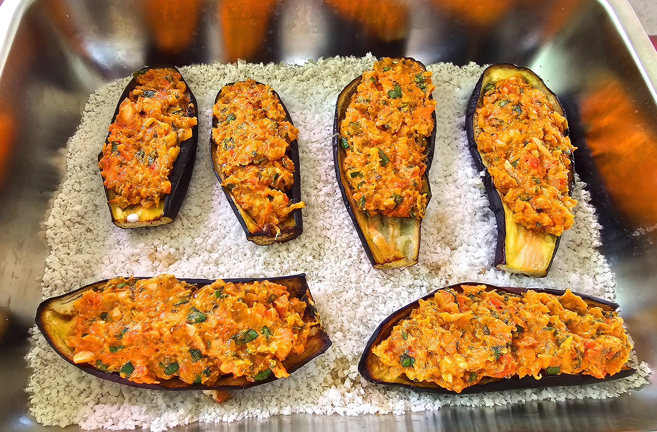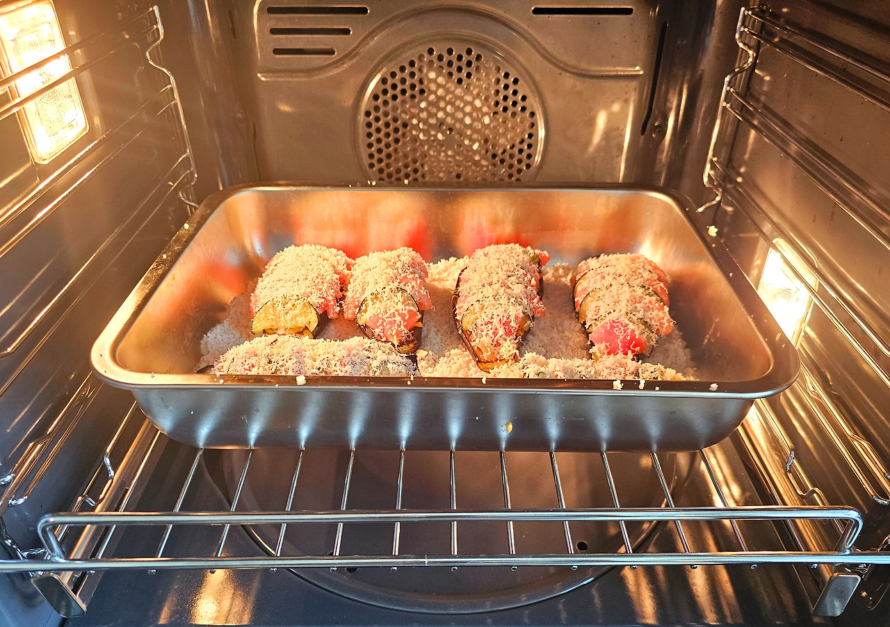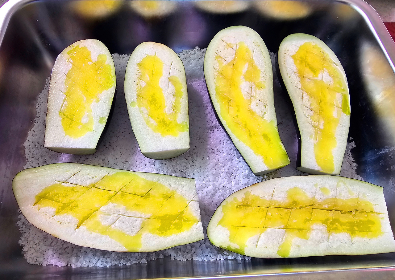 가지는 꼭지를 잘라내고 길게 2 등분하여 자른다. 그리고 가지 속을 격자무늬로 칼집을 내준다. 너무 깊게 하면 가지가 찢어질 수 있으니 주의하자. 오븐용 용기를 준비하고 바닥에 굵은소금을 깔아준 다음 가지껍질이 소금 쪽을 향하도록 놓는다. 올리브오일을 가지 위에 살짝 부어주고 200도 예열된 오븐에 25분간 구워준다.