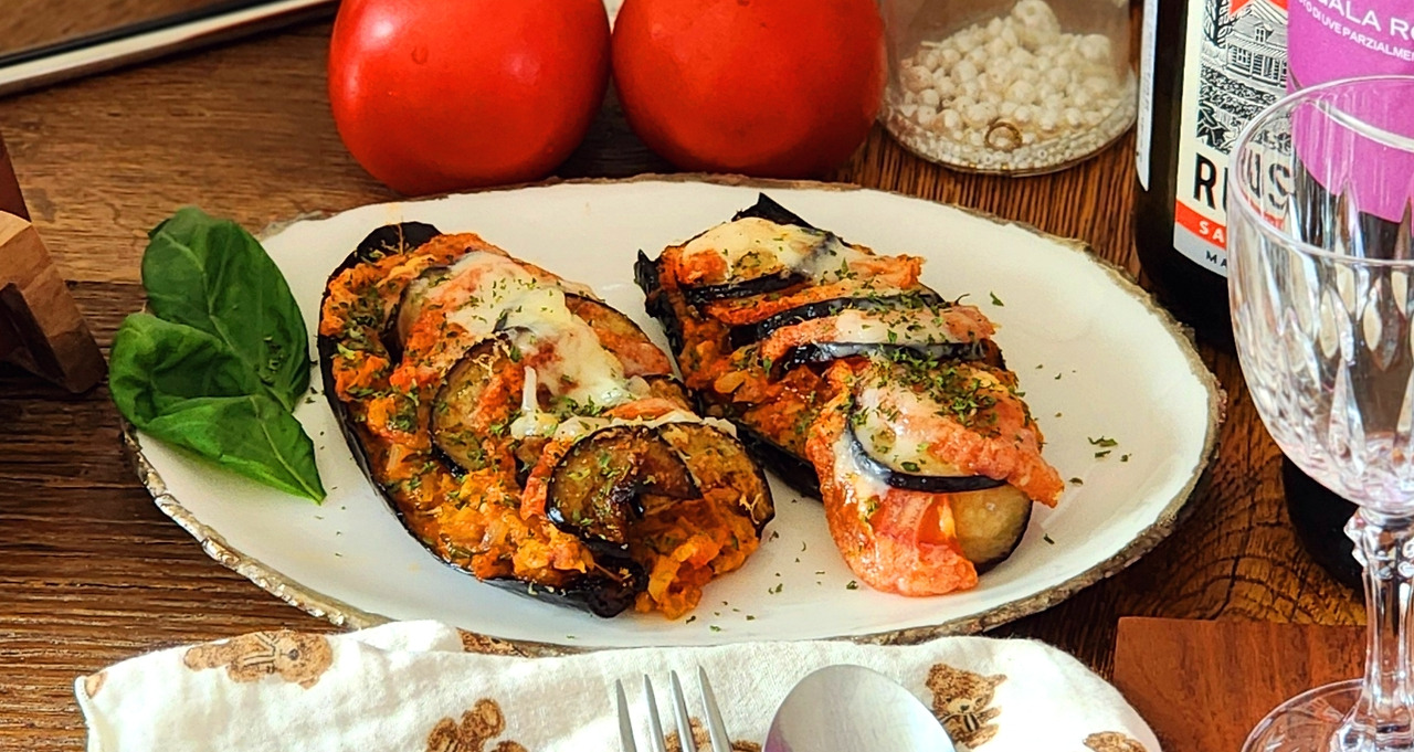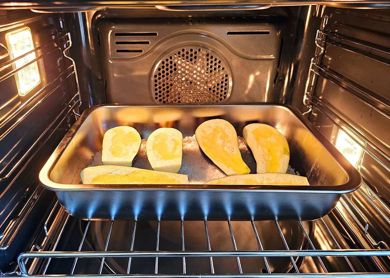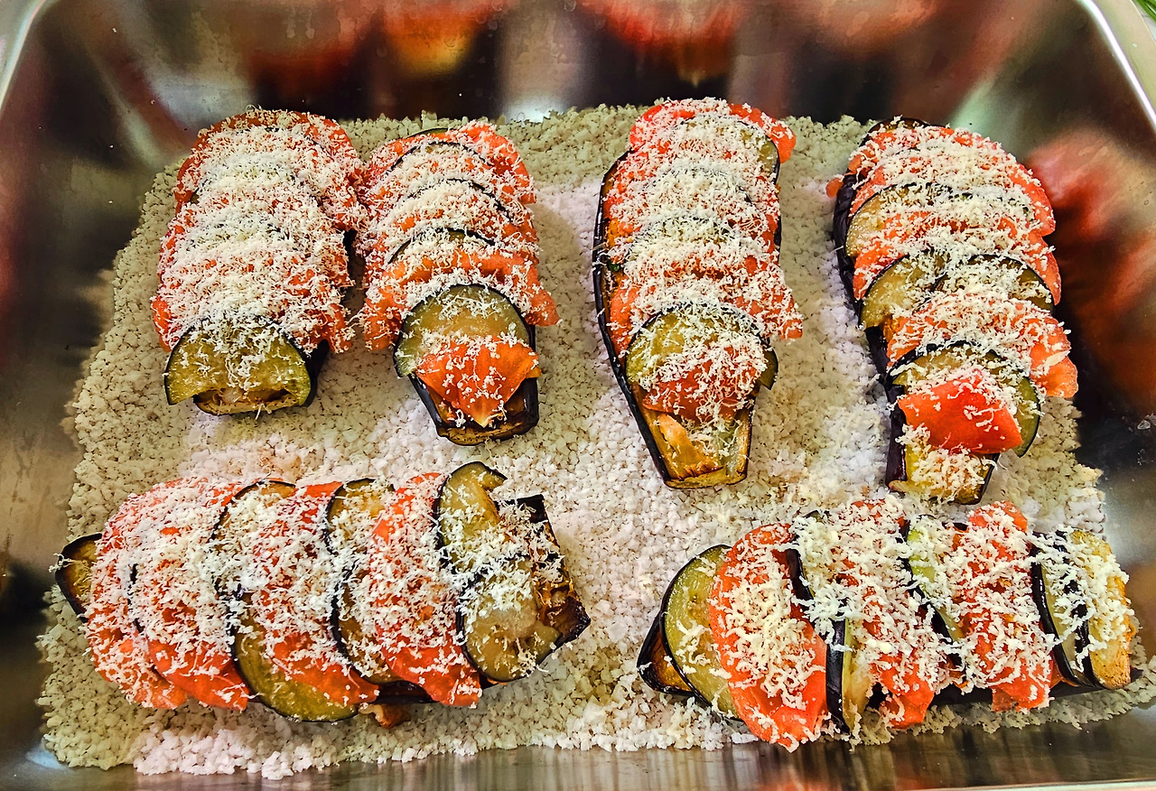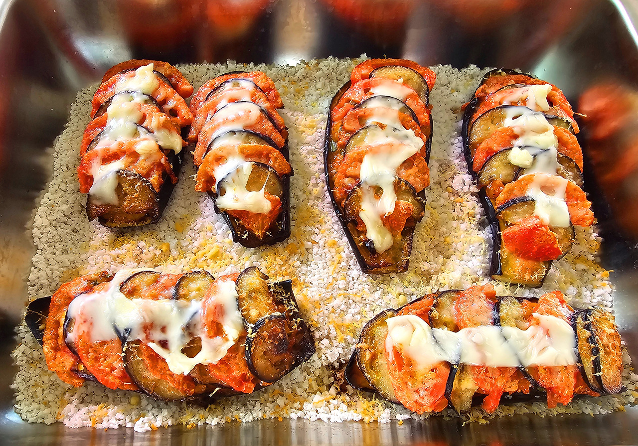 가지는 꼭지를 잘라내고 길게 2 등분하여 자른다. 그리고 가지 속을 격자무늬로 칼집을 내준다. 너무 깊게 하면 가지가 찢어질 수 있으니 주의하자. 오븐용 용기를 준비하고 바닥에 굵은소금을 깔아준 다음 가지껍질이 소금 쪽을 향하도록 놓는다. 올리브오일을 가지 위에 살짝 부어주고 200도 예열된 오븐에 25분간 구워준다.