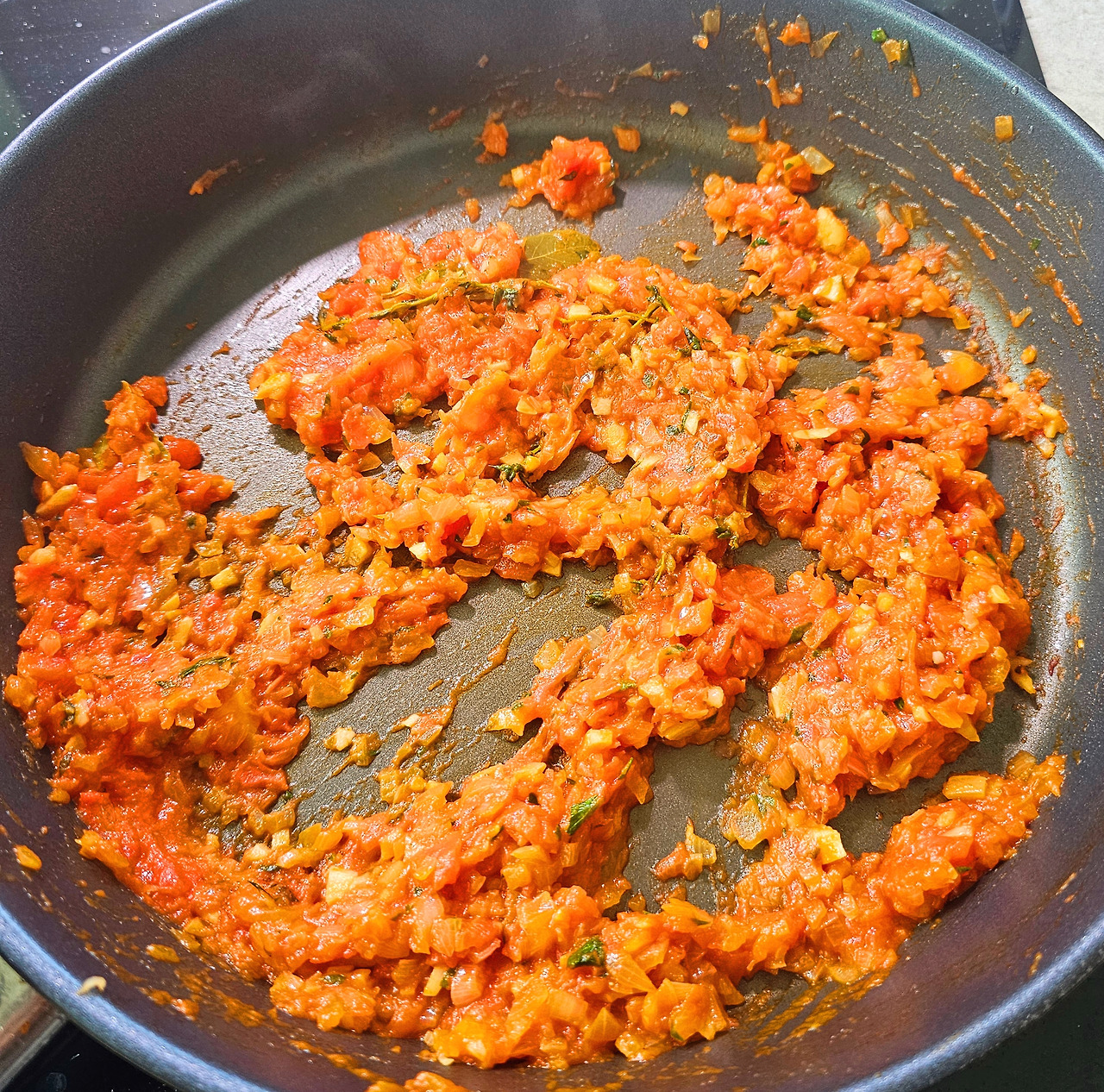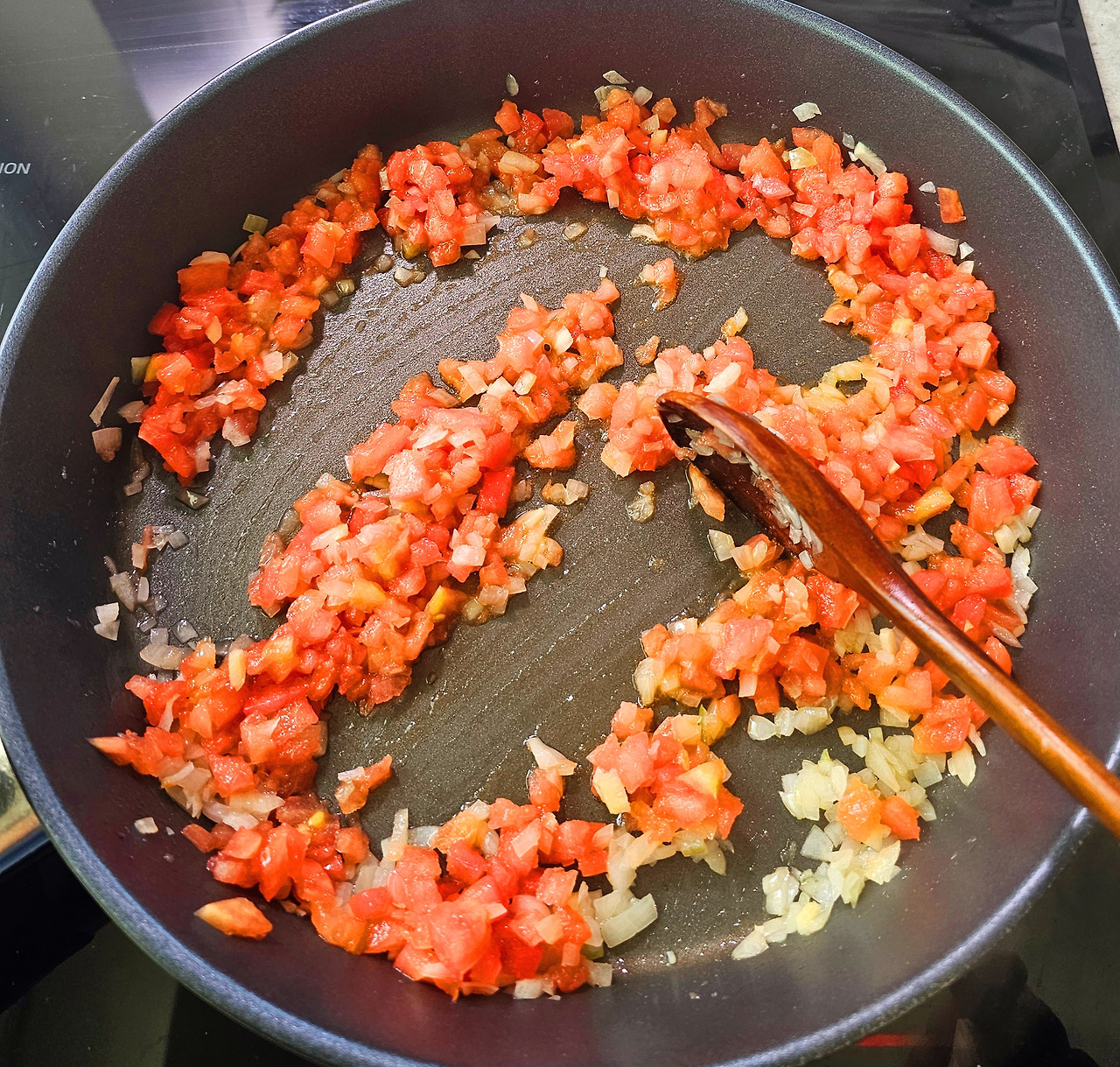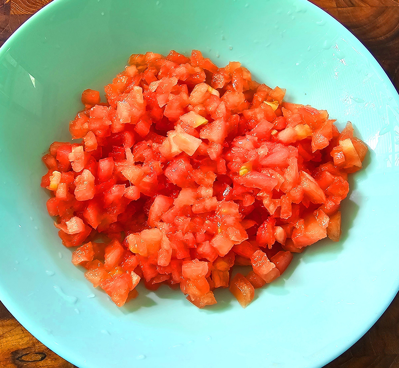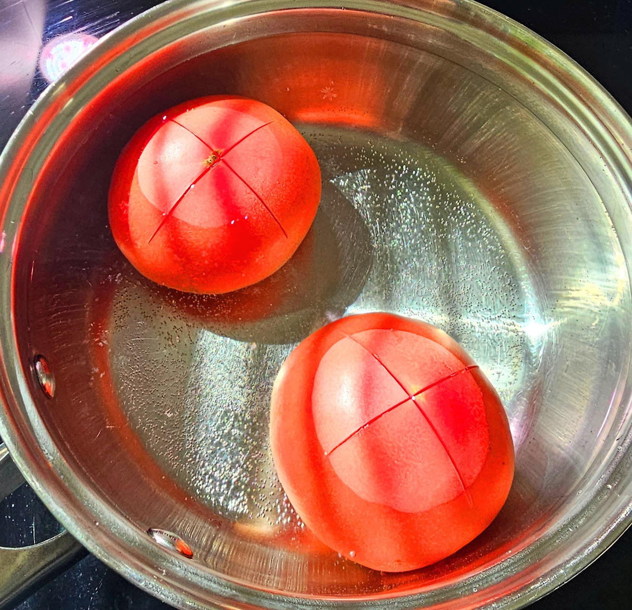 토마토 콩카세를 준비하자. 콩카세는 "바질향이 나는 토마토 크림 포타주"에서 나온 용어인데 채소를 아주 작은 주사위 모양으로 만드는 것을 말한다. 토마토에 열십자로 칼집을 내주고 끓는 물에 데친 후 건져 찬물에 담근다. 그러면 껍질이 쉽게 벗겨지고 씨는 제거하고 주사위 모양으로 썰어준다.