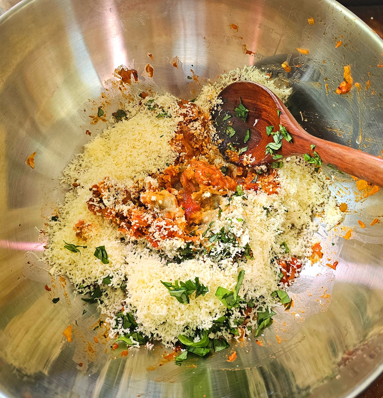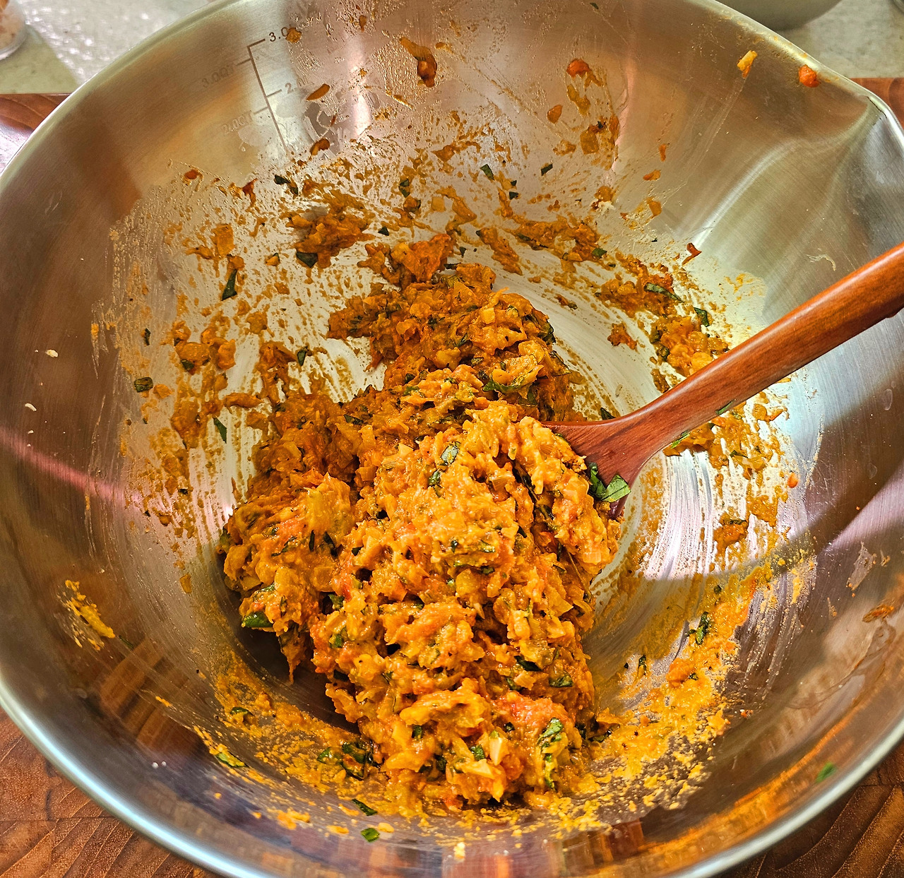 이제 볼에 옮겨 담고 잘게 썬 가지와 바질을 넣어준다. 소금과 후춧가루, 카이엔후추, 그뤼에르치즈를 넣고 잘 섞어주면 속이 완성된다. (약간 만두소 같은 느낌이 든다.)