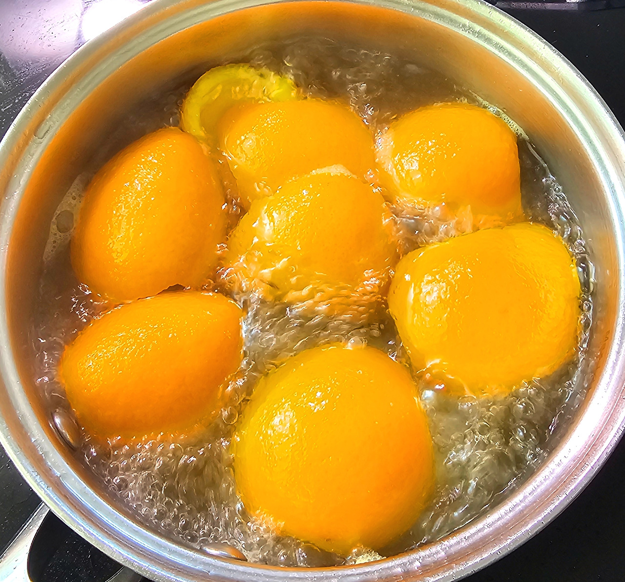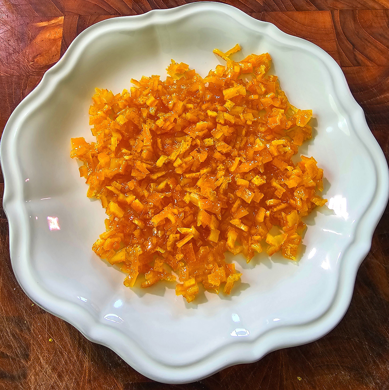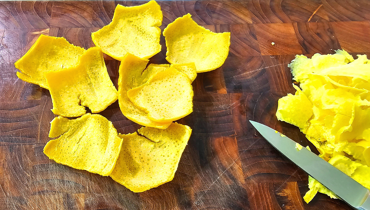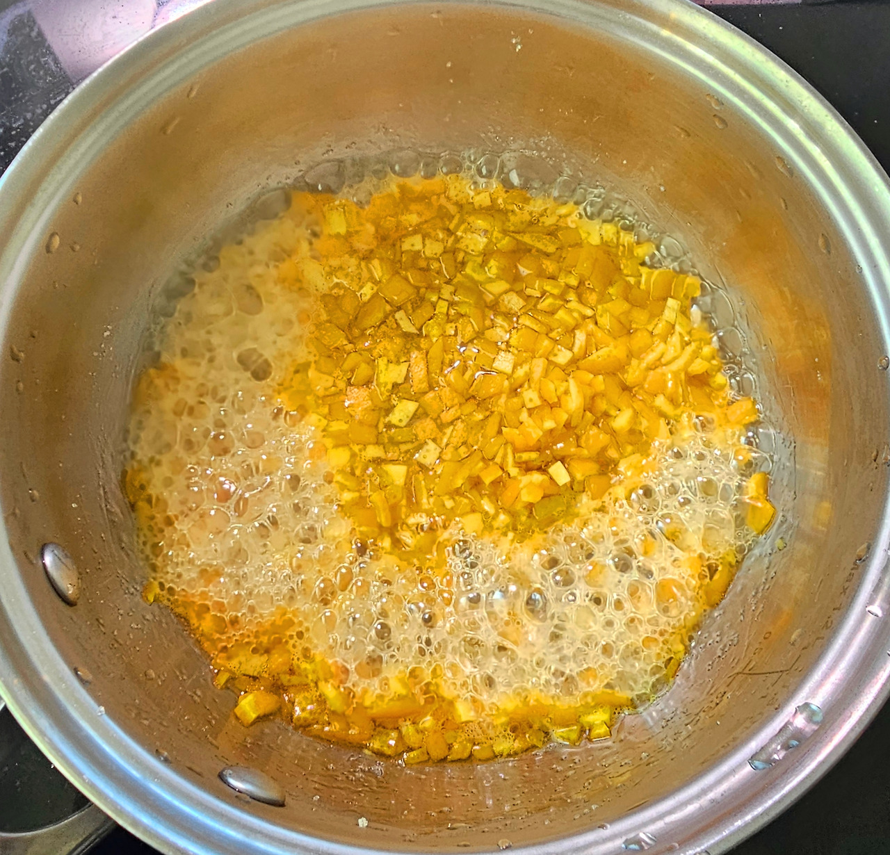 껍질을 잘게 썬 다음 냄비에 설탕과 껍질을 2:1 비율로 넣고 끓인다. 오렌지에서 물이 나오는데 자작해질 때까지 조려준다. 그릇에 옮긴 후 넓게 펼쳐주고 식혀준다. 맛을 보면 마치 청을 먹는 듯한 느낌이 들고 오렌지의 향과 달달한 맛이 정말 좋다.
