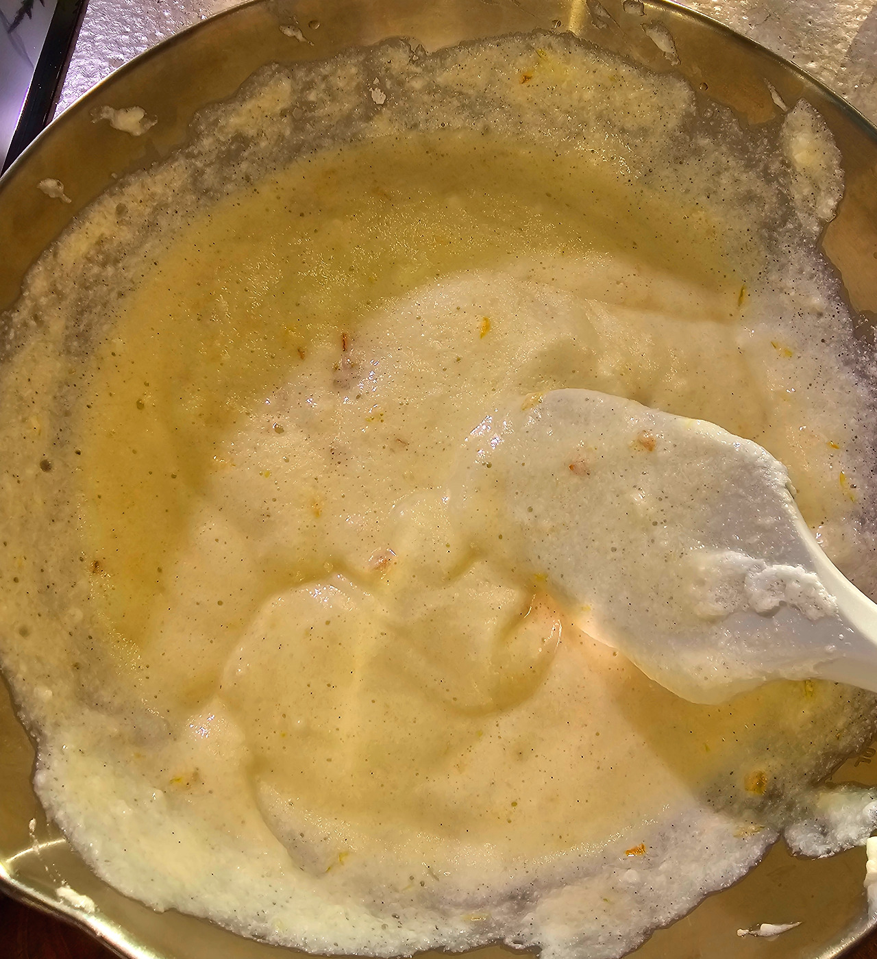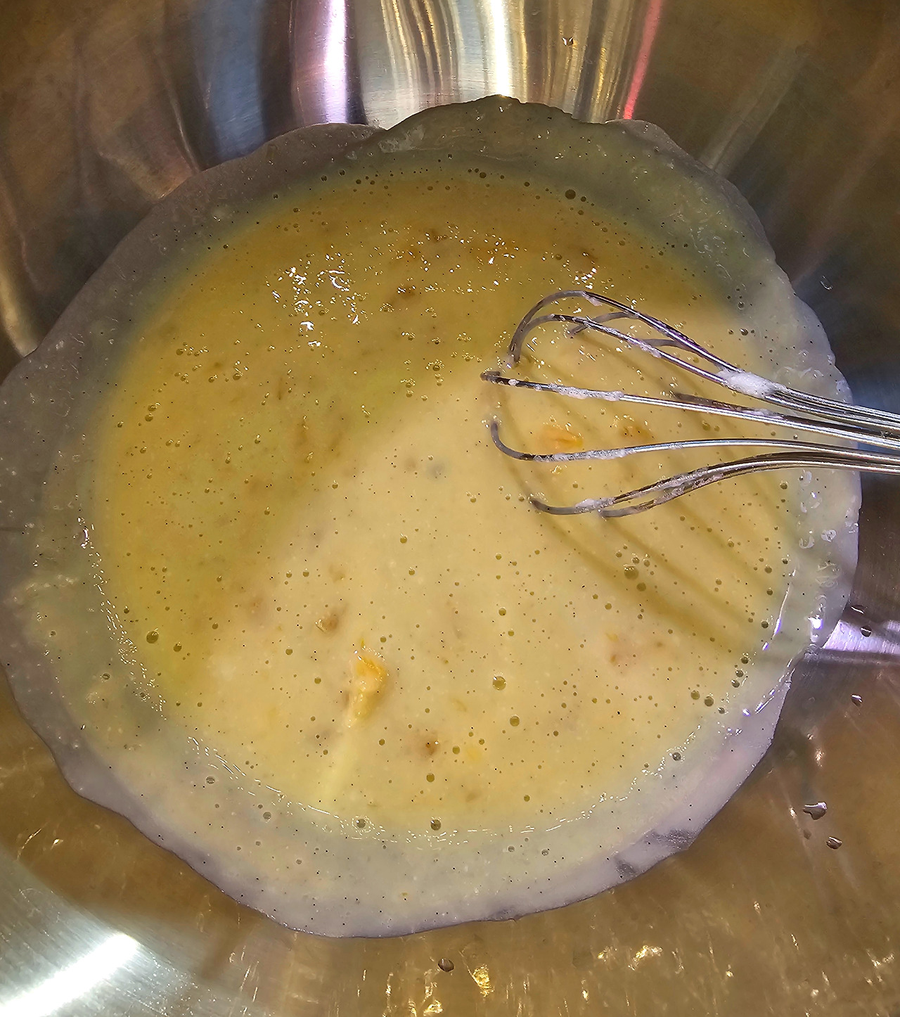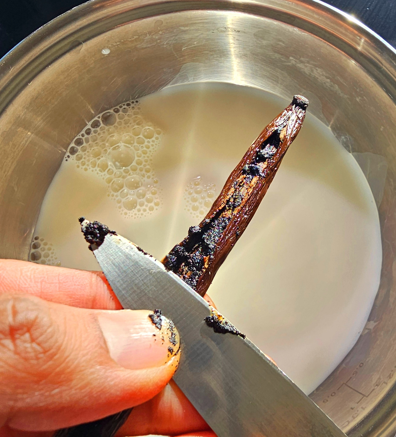 여기에 바닐라빈이 들어간 우유를 조금씩 부어 주면서 섞어 주고 냄비에 다시 옮겨 담고 끓여준다. 끓기 시작하면 다시 볼에 옮겨 담는다. (도대체 몇 번이나 옮겨 담는 것이냐!)