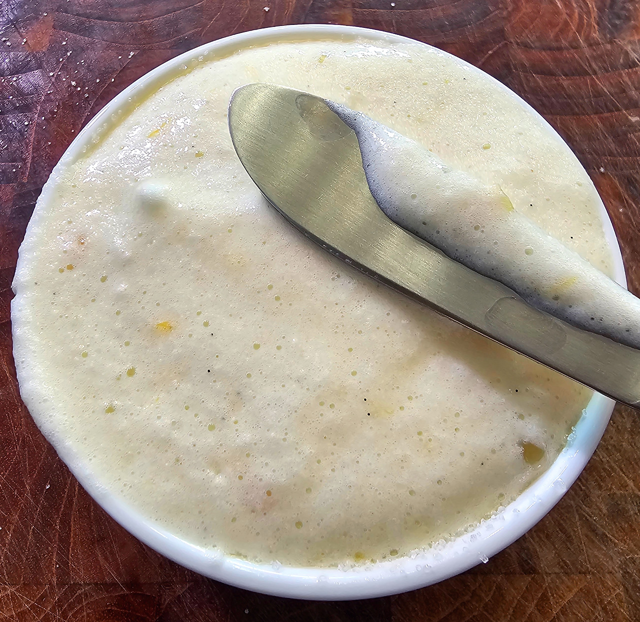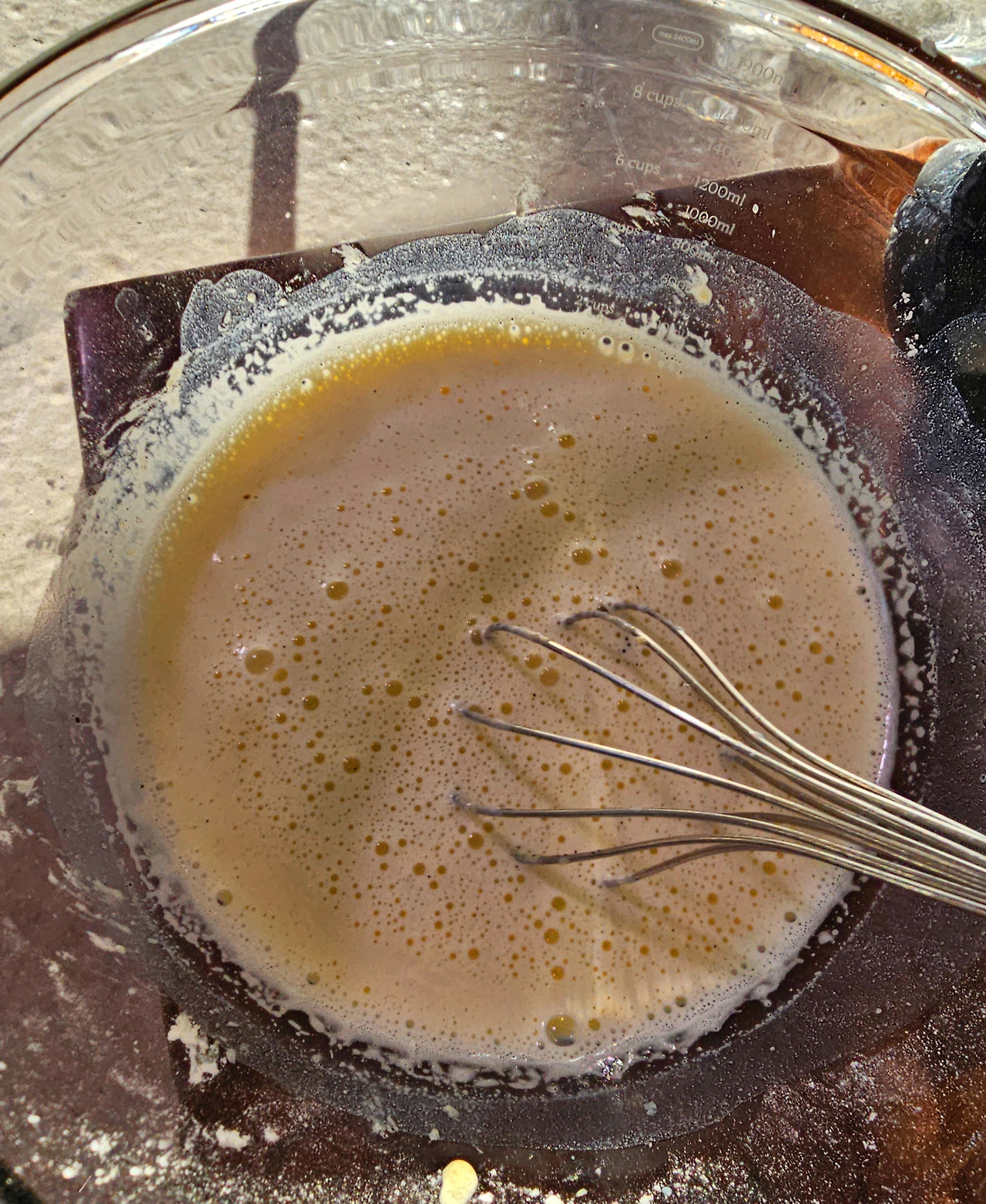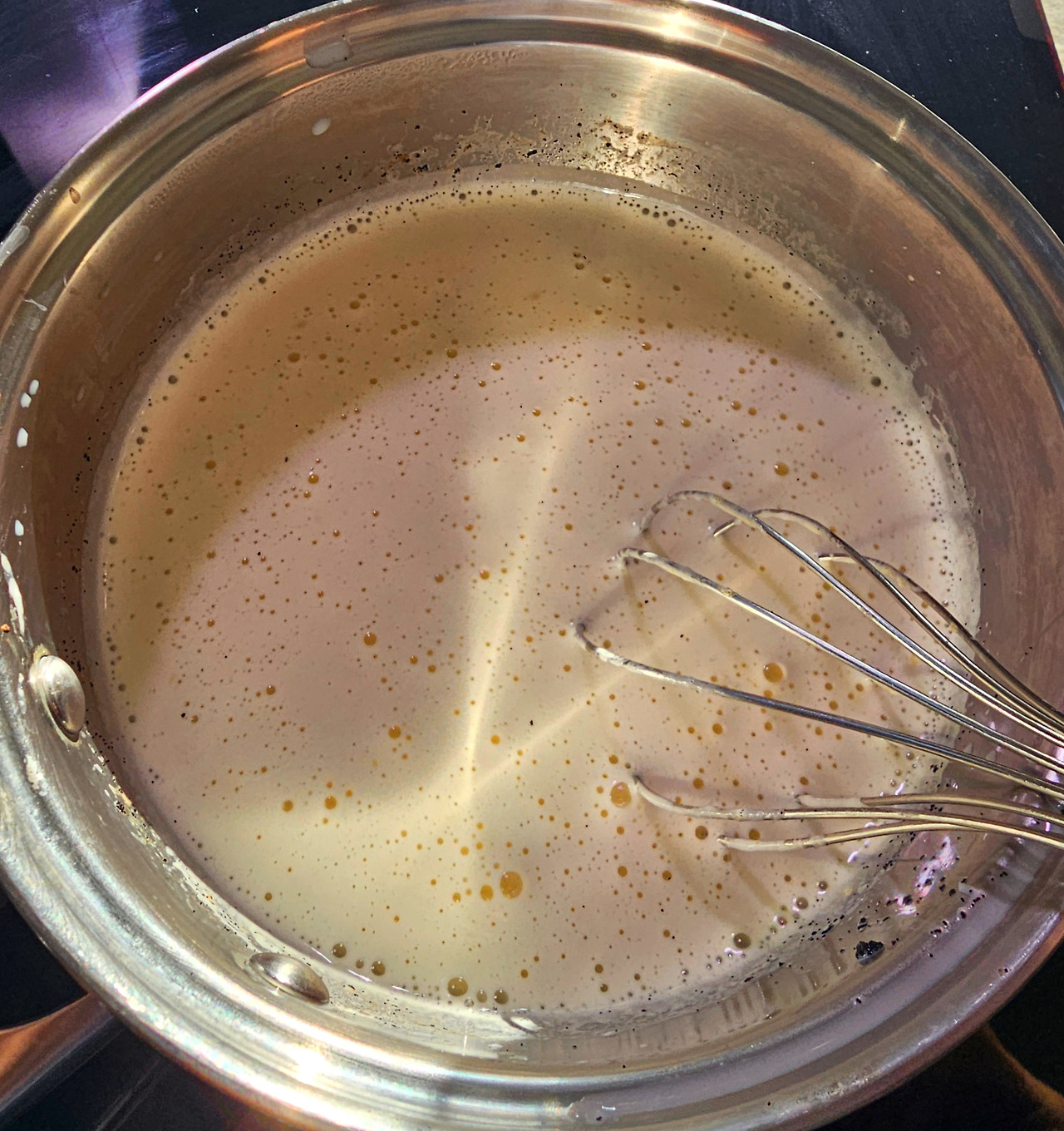 여기에 바닐라빈이 들어간 우유를 조금씩 부어 주면서 섞어 주고 냄비에 다시 옮겨 담고 끓여준다. 끓기 시작하면 다시 볼에 옮겨 담는다. (도대체 몇 번이나 옮겨 담는 것이냐!)