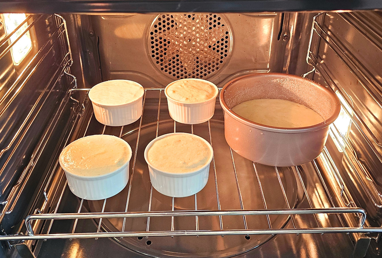 수플레 틀에 버터를 바르고 설탕을 골고루 묻혀준다. 여기에 반죽을 부은 후 표면을 매끈하게 정리해 준다.