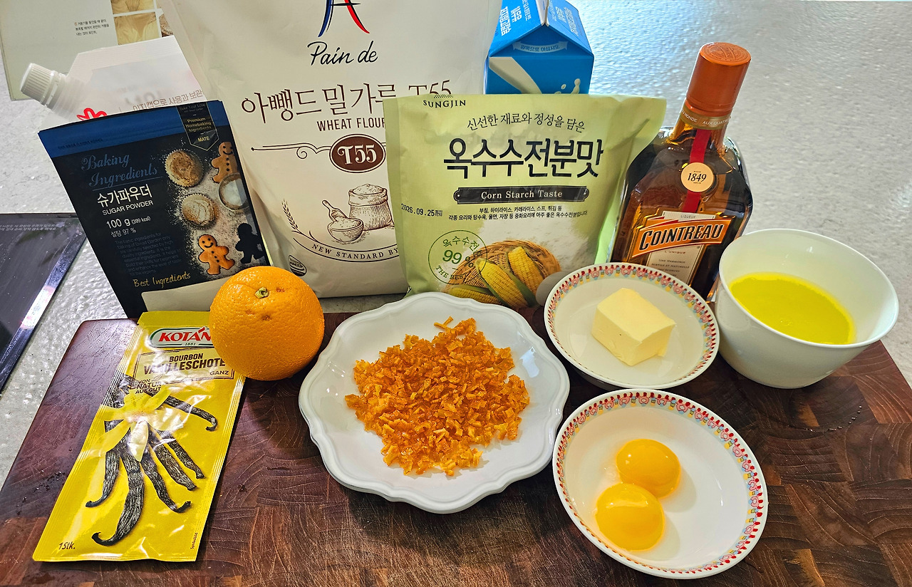 오렌지 과육, 오렌지 필, 우유, 쿠앵트로, 달걀노른자, 달걀흰자, 설탕, 밀가루, 옥수수 전분, 바닐라빈, 버터, 슈가파우더