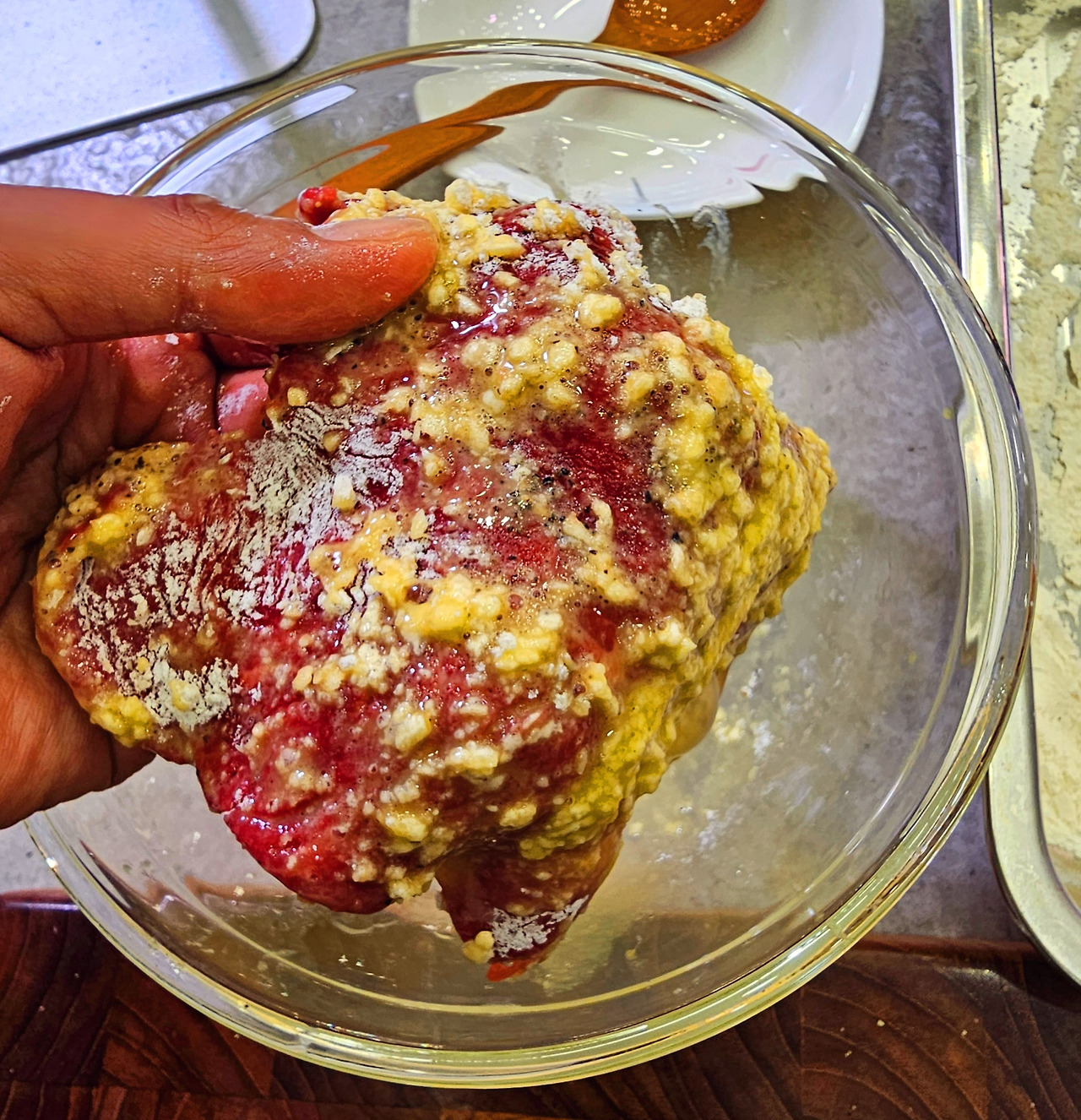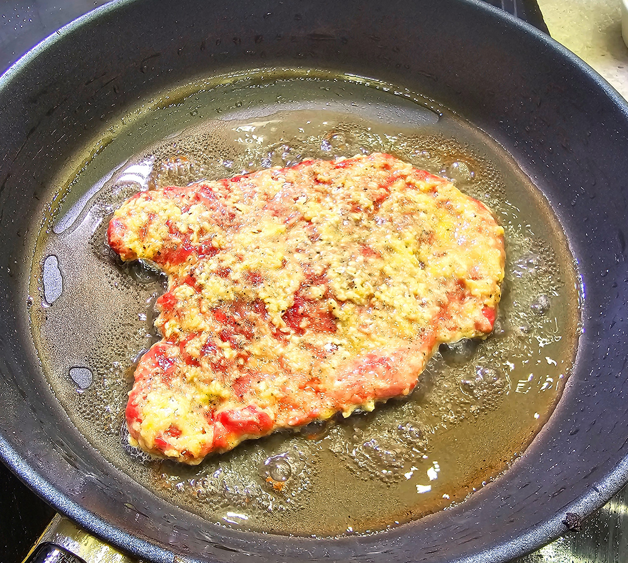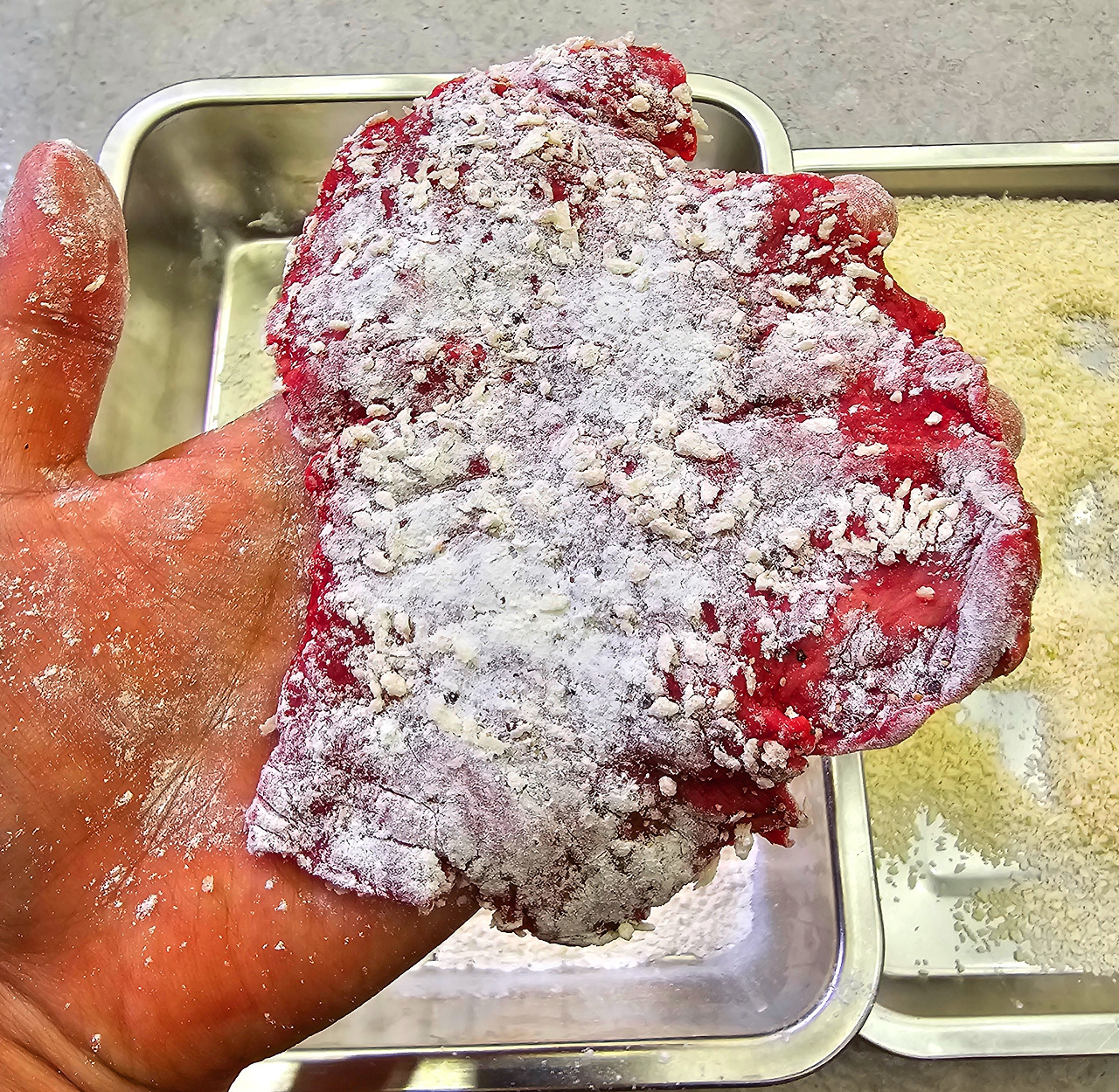 소고기를 랩으로 감싸고 고기망치로 살살 두들겨 넓게 펴준다. 고기 양면을 소금과 후춧가루로 간을 해주고 밀가루를 앞뒤 골고루 묻혀준다. 그리고 고기를 달걀물에 충분히 적혀준 다음 빵가루를 빈틈없이 묻혀준다.