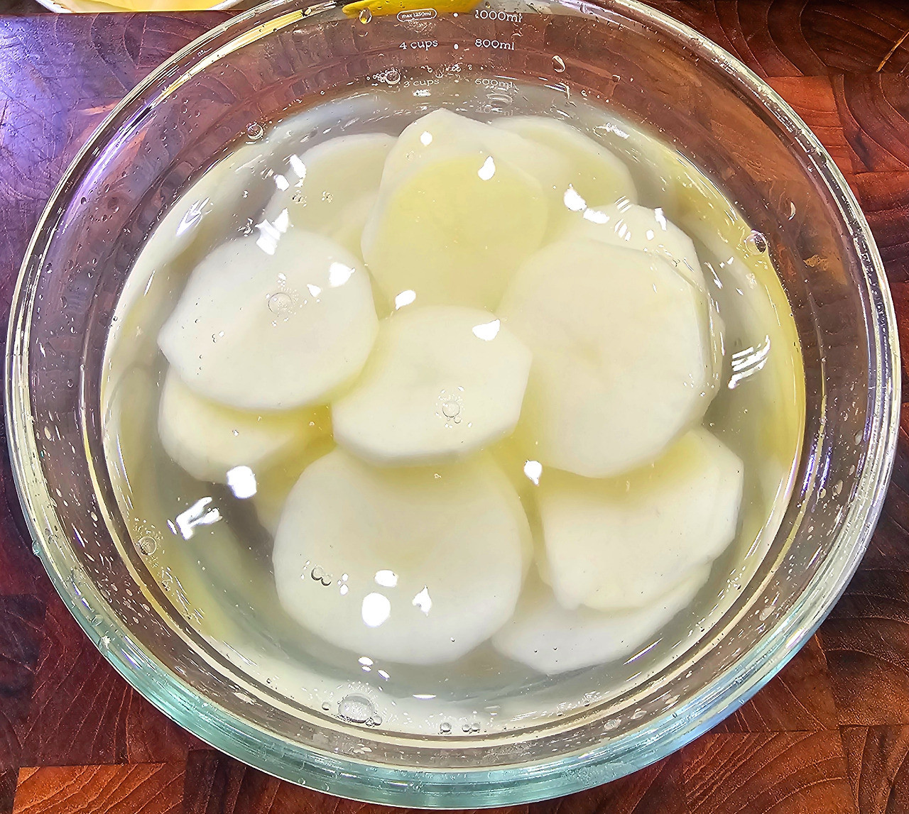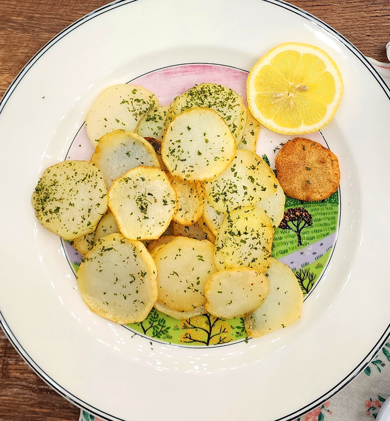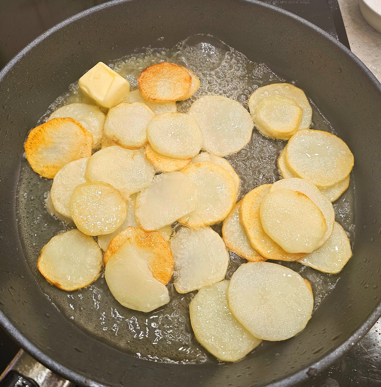 이제 감자 소테를 만들어 보자. 감자 껍질을 벗기고 원형 모양으로 돌려 깎는다. 감자를 얇게 썰어주고 물에 담가 전분을 빼준다. 키친타월로 감자에 물기가 없도록 충분히 닦아준다. 프라이팬에 기름을 두르고 감자가 노릇노릇하게 맛있는 색깔로 변하면 버터를 넣고 고소한 맛을 가미해 주고 소금과 후춧가루로 간을 해준다.