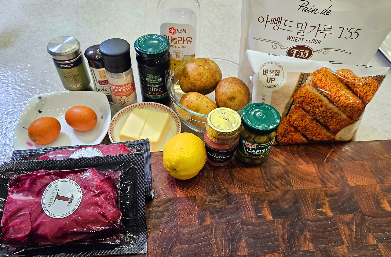 이번 메인요리는 간단한데 장식 준비하는데 더 많은 재료가 필요하다. 마트에 앤초비가 없어서 인터넷으로 구입하였다. 그리고 이번에도 고기는 송아지가 아닌 다 큰 어른소를 이용하였다.
