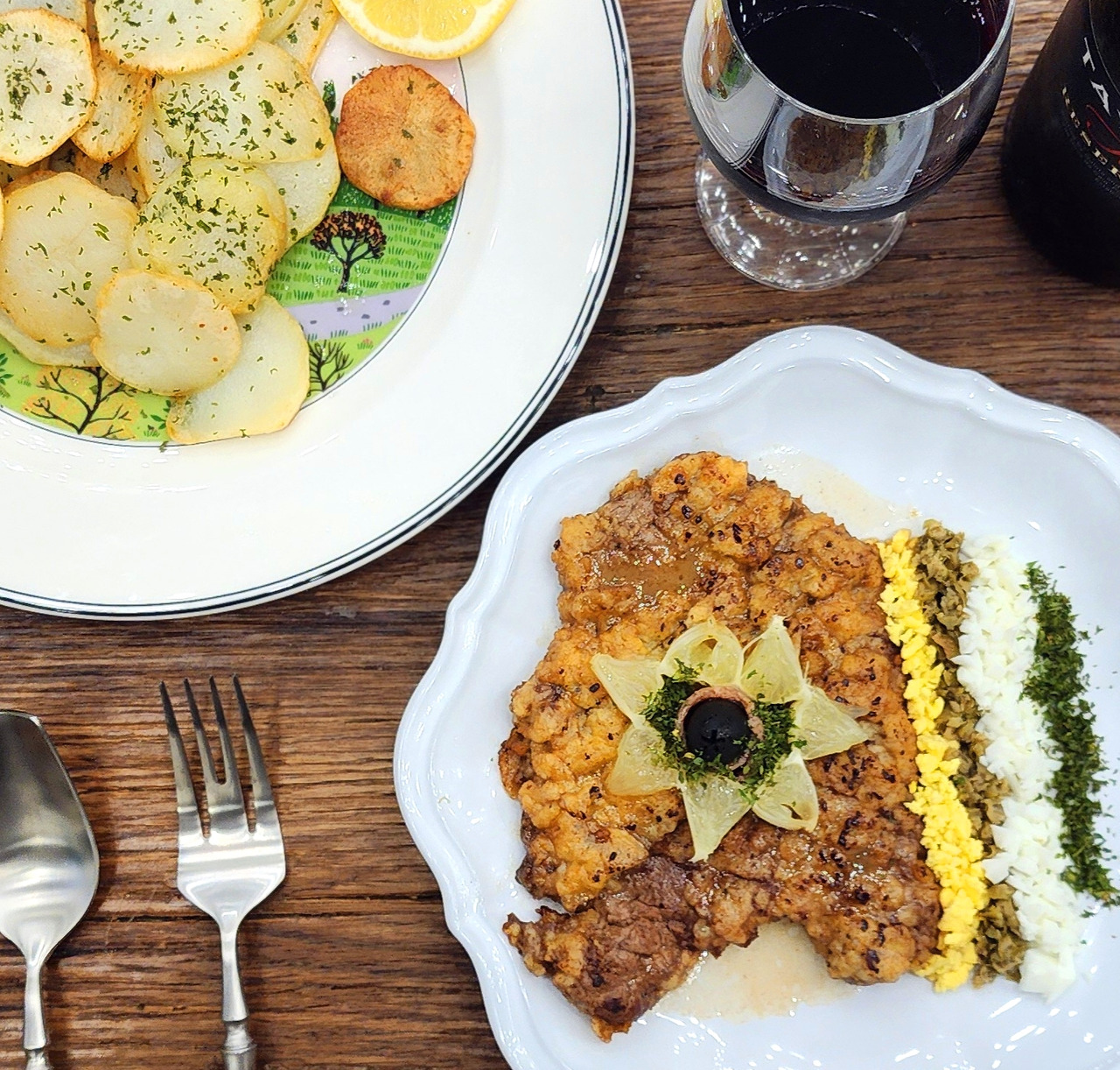 "고기만 먹을 때는 맛없다. 레몬과 같이 곁들여 먹으니 좋다. 튀김옷이 바삭바삭하지도 않은데 왜 있는 거지? 원래 바삭바삭해야 하는데 요리를 잘못한 거 아닌가? 올리브랑 앤초비가 없으면 별로였을 것 같다. 마치 소고기육전을 먹는 듯한 느낌을 받았다. 감자소테는 그냥 감자칩 같다." (맞다. 요리 망했다.)