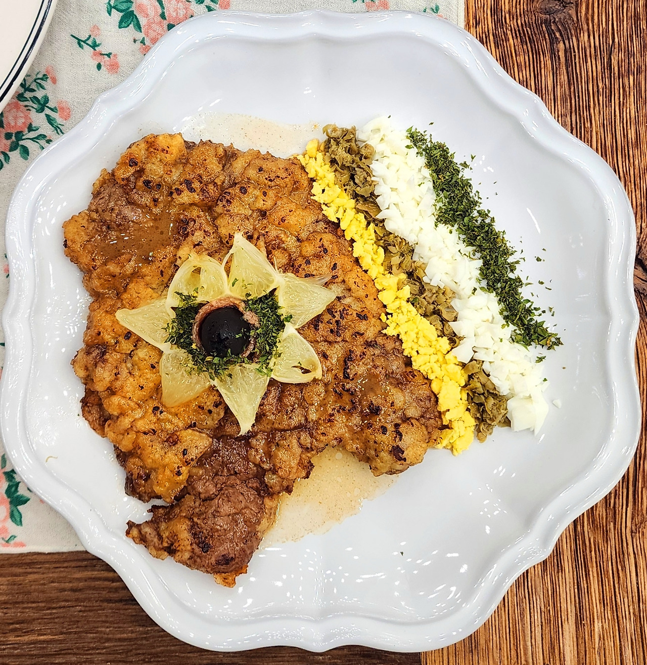 접시에 에스칼로프를 담고, 주변에 달걀흰자, 노른자, 케이퍼와 파슬리를 다져서 장식해 준다. 그리고 에스칼로프 중앙에 레몬, 앤초비, 올리브를 올리면 메인요리 완성이다.