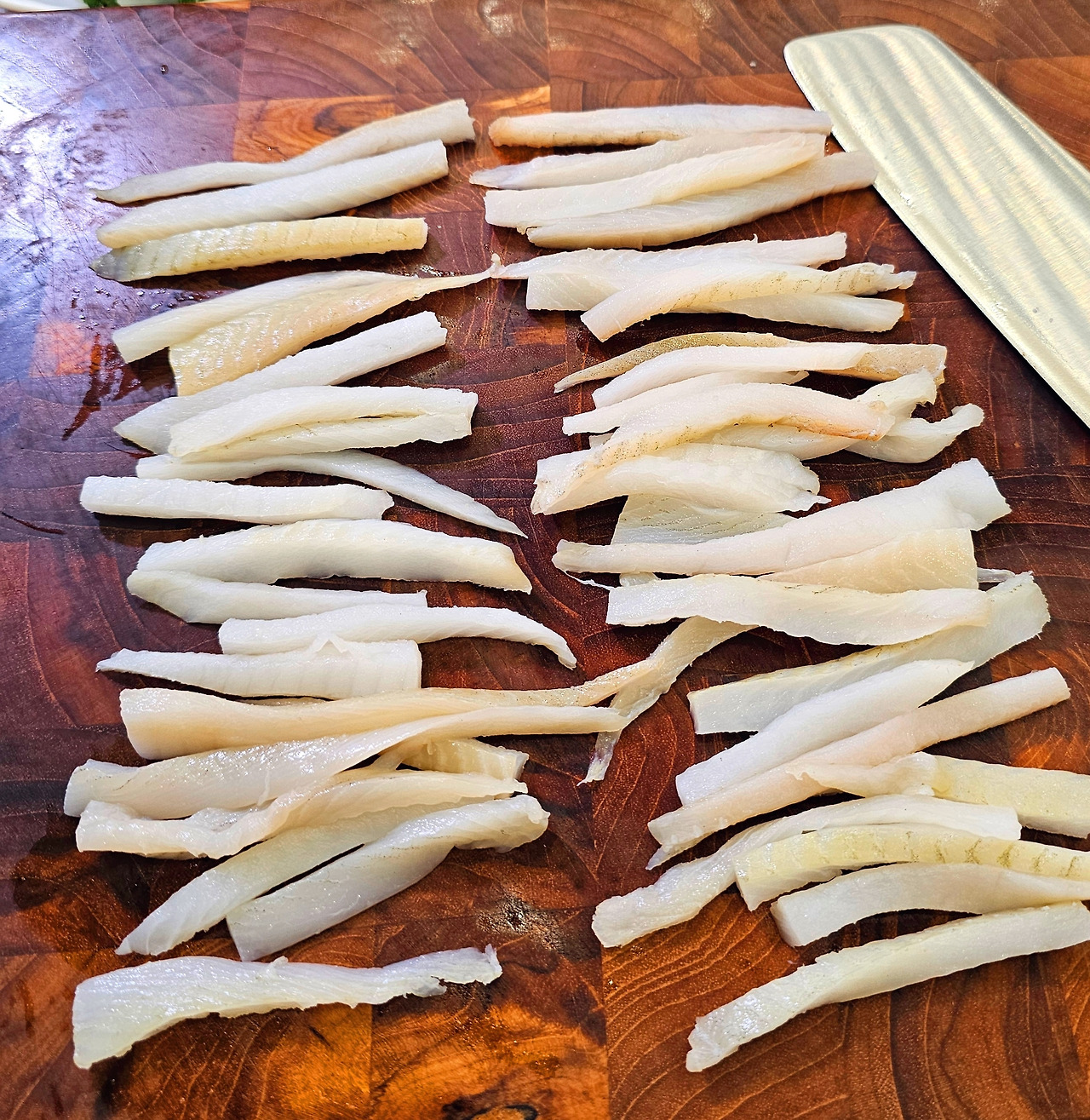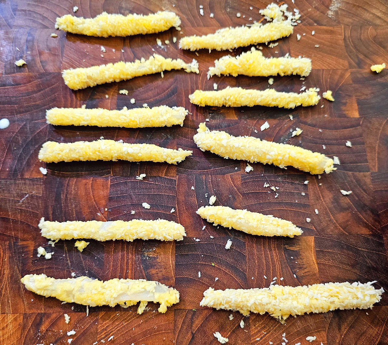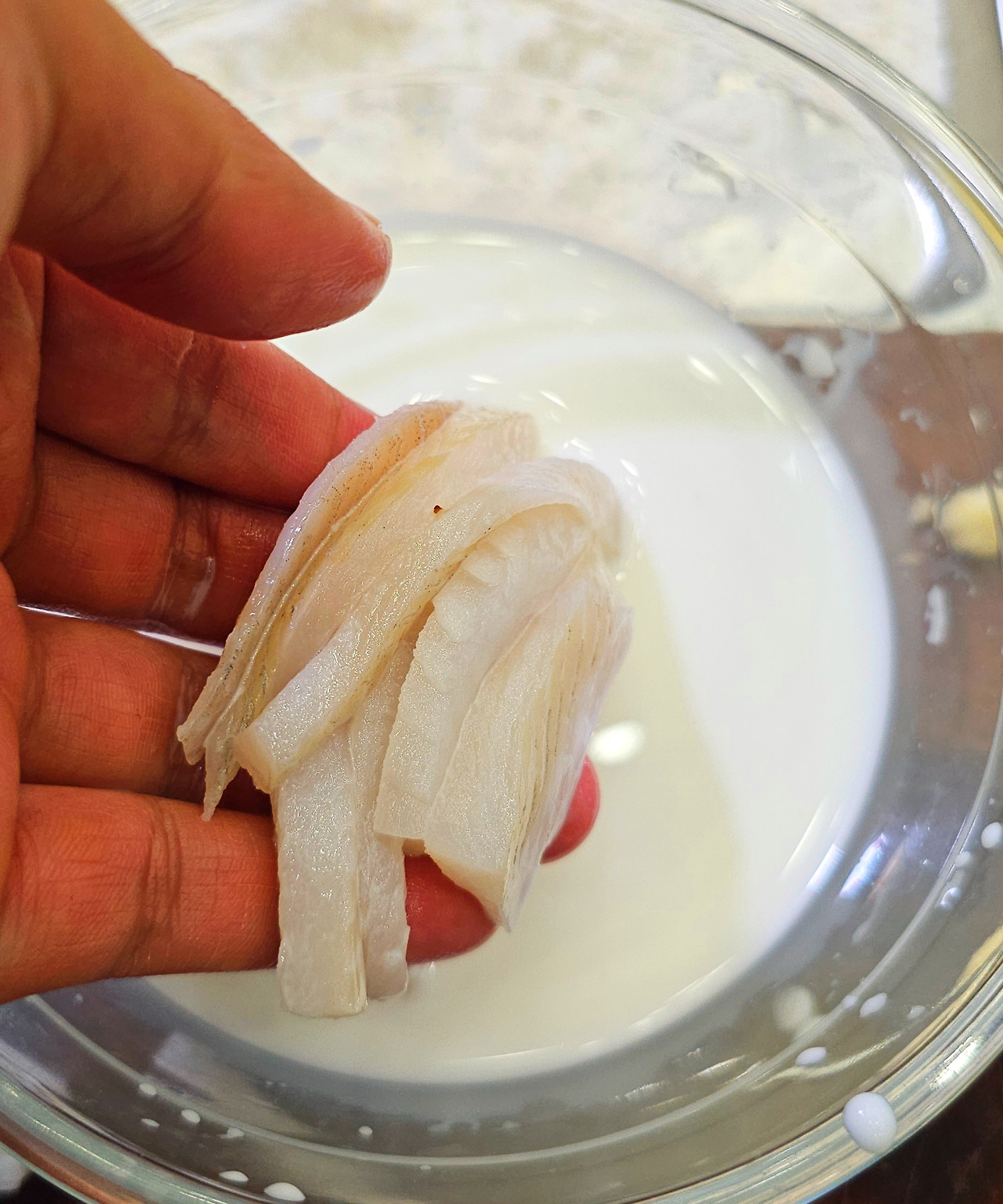 가자미살을 가늘고 길게 썰어준다. 우유에 담갔다가 밀가루를 충분히 묻혀준다. 그리고는 올리브오일을 넣은 달걀물에 담근 다음 빵가루를 골고루 묻혀준다.